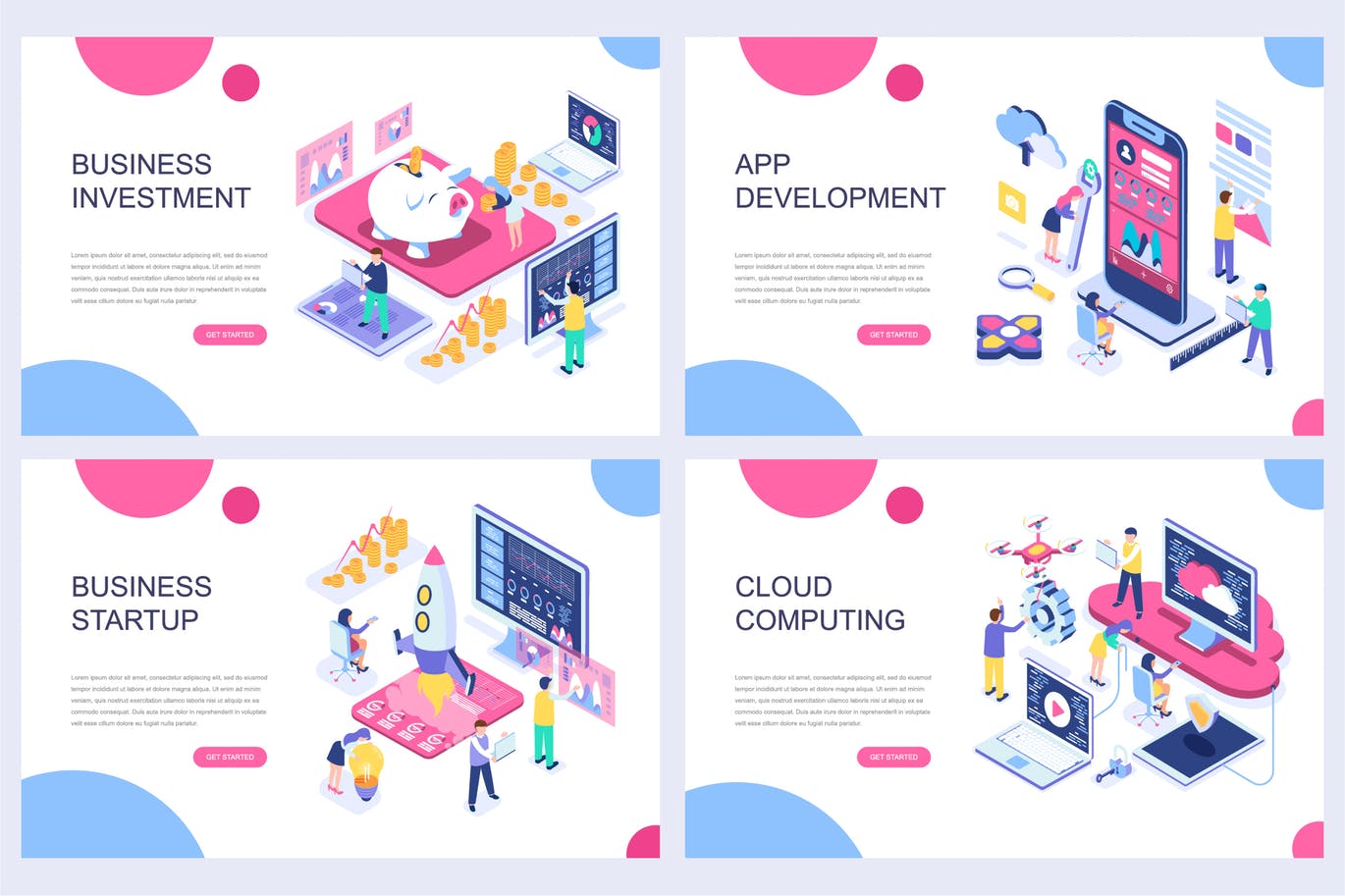 这次老不湿分享的是,时尚现代平面设计的等轴等距2.5D区块链blockchain概念banner着陆页海报巨无霸设计模板-2,登陆页面模板集。网页设计的3D等量概念网站和流动网站的。矢量图。