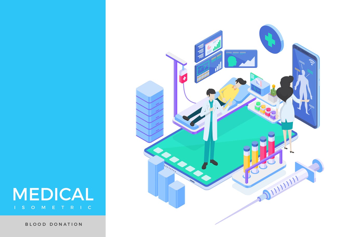 这次老不湿分享的是,时尚多用途的2.5D等轴等距鲜血抽血医院医生banner海报巨无霸设计模板,矢量文件