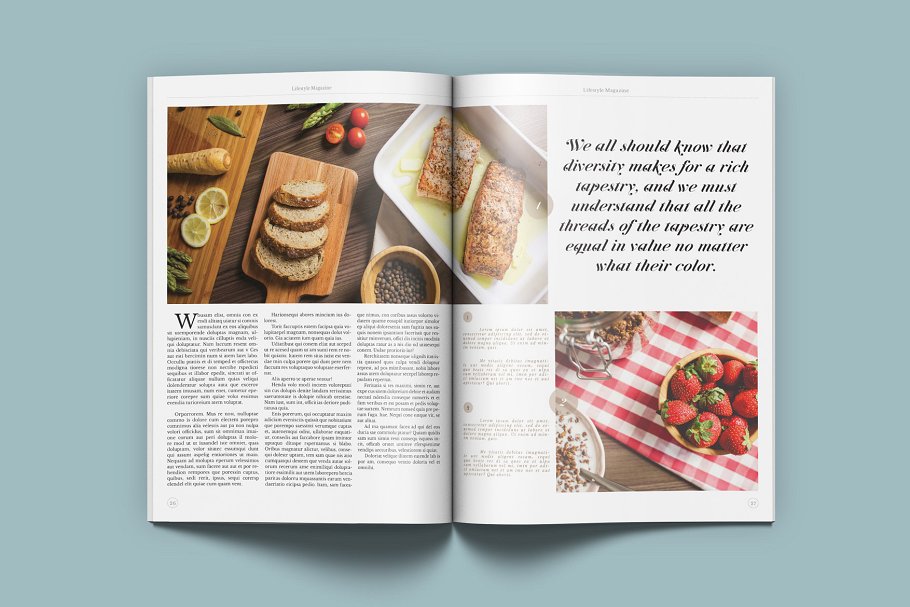 时尚生活方式的杂志被设计成一个具有原创结构编辑版面的通用杂志模板。模板可以很容易地用于许多编辑内容,比如宣传册、时尚设计或者最小的优雅设计。