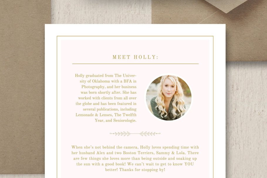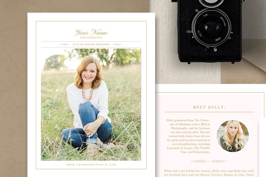 使用这个摄影定价指南作为一个数字或印刷件发送给客户! 虽然这个预写文本适合高级摄影师,但是您可以很容易地更新文本、字体和颜色,以便在婚礼和其他活动中使用。把你的商标拖拽到展板上,为你的企业创造一个无缝的品牌!
