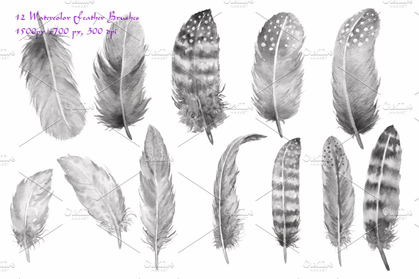 这一套笔刷包括12根高分辨率羽毛,来自水彩画。笔刷大小约为500px x 1500px, 300dpi,文件格式为ABR。