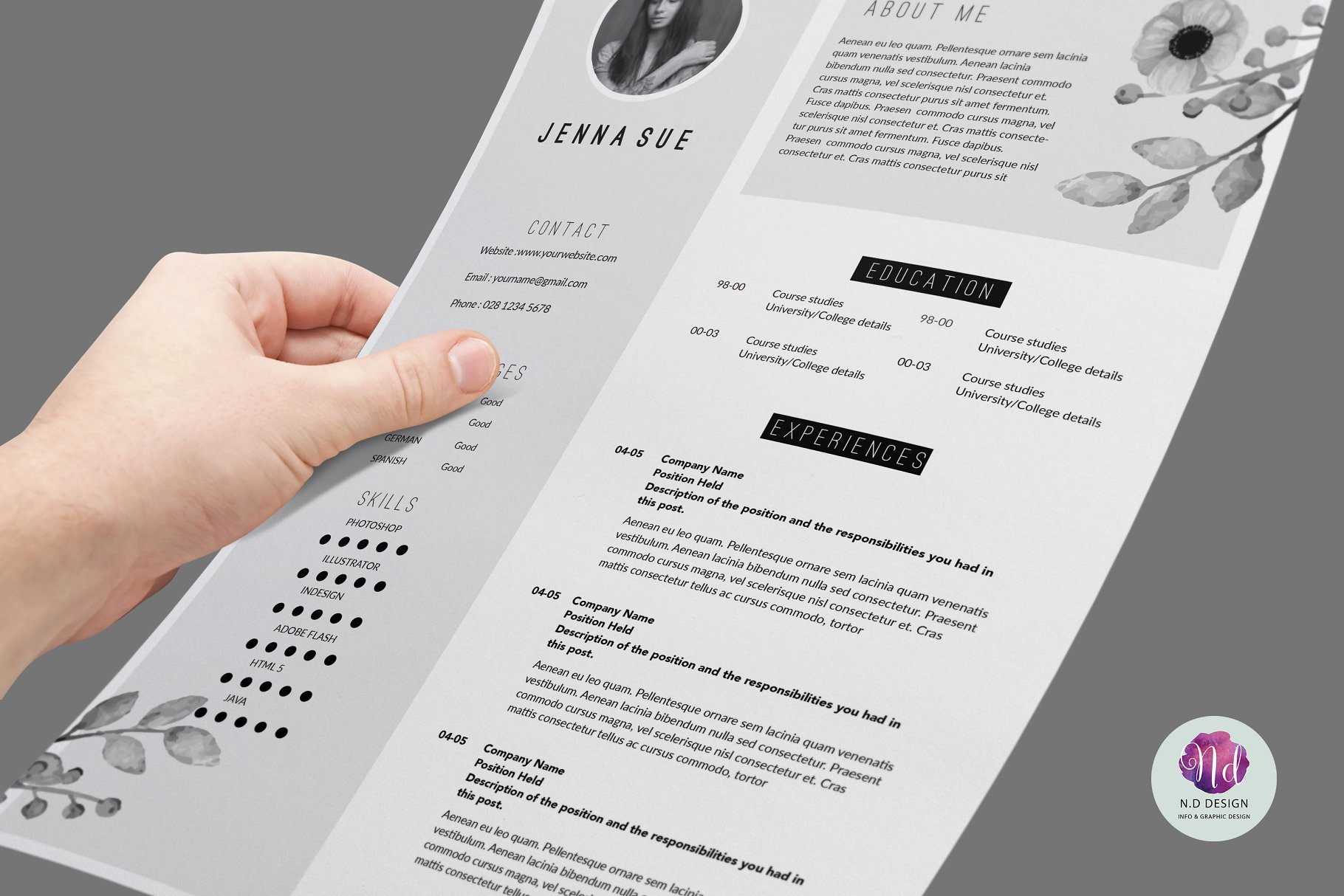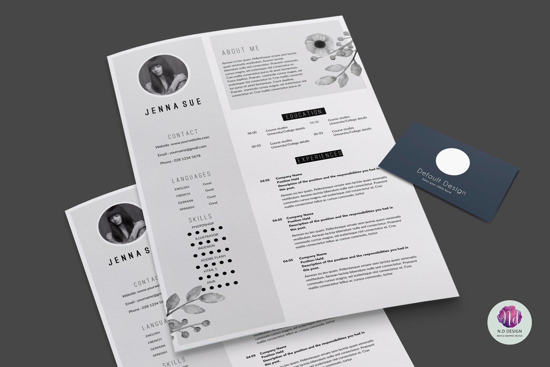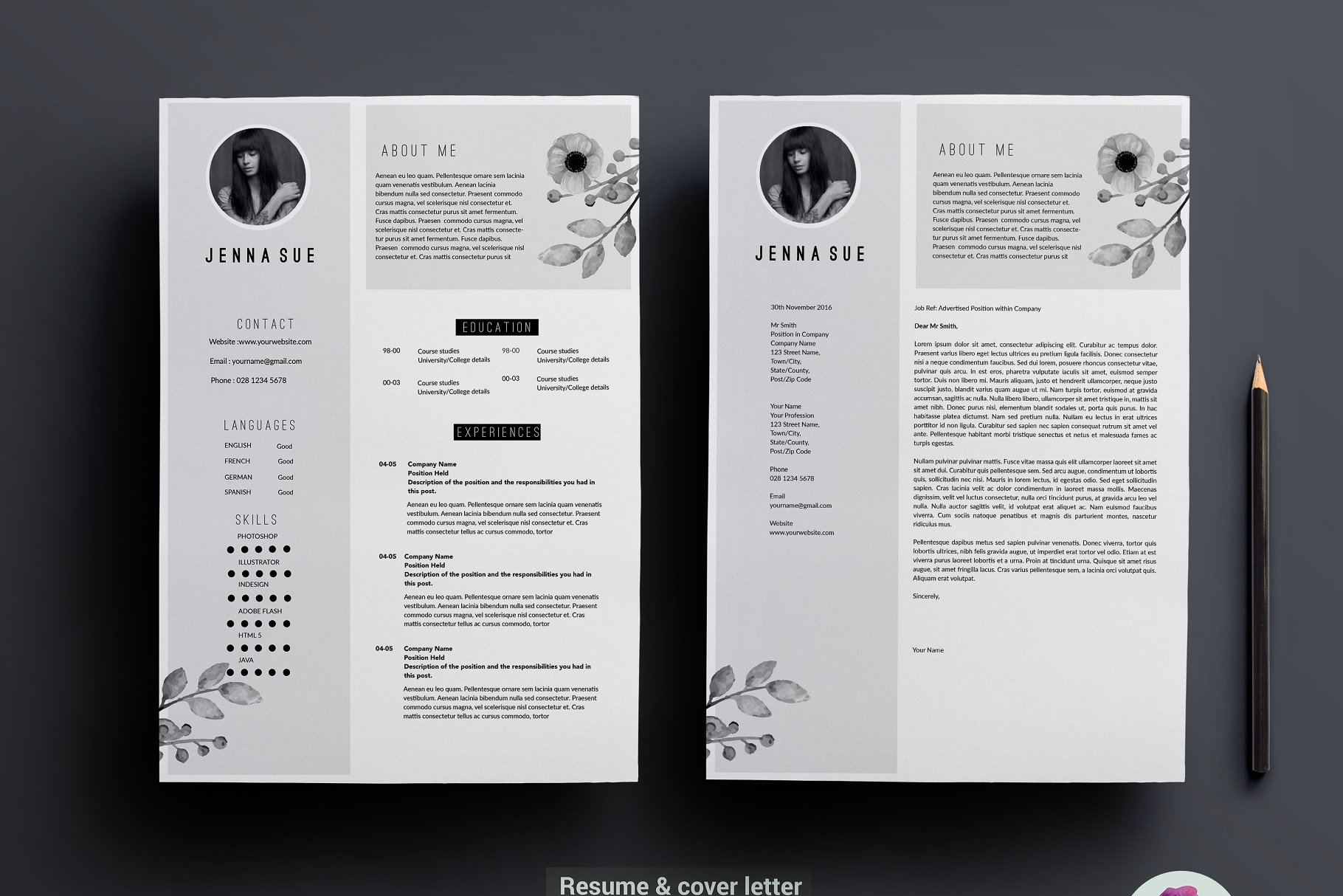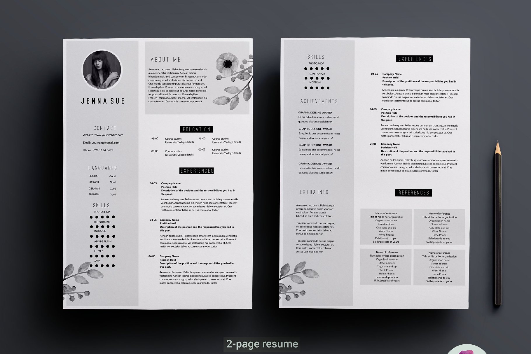 这份优雅而专业的简历会帮助你引起别人的注意! 该套装包括一份两页的简历样本,带有漂亮花卉主题的求职信。这个模板很容易改变颜色、布局和字体,以适应您的需要。