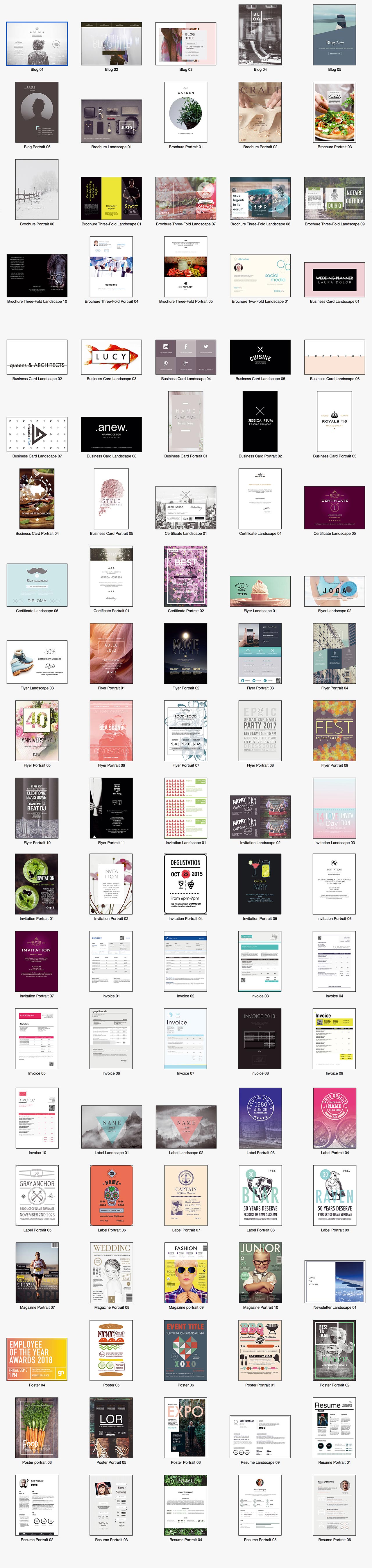 今天分享的这个资源,Templates for InDesign – Alungu Designs高品质的indesign模版下载[For Mac2.0.1],绝对是平面设计同学的福音,其中包含了100种不同的模版,包含的品类有:各种Blog网站形象图、画册、三折页、名片、证书、传单、邀请函、选票、出场标签、杂志封面、海报和简历等,这绝对是你快速提升设计品质和想法的利器,enjoy!(注意,第二排第二个CC2017打不开)