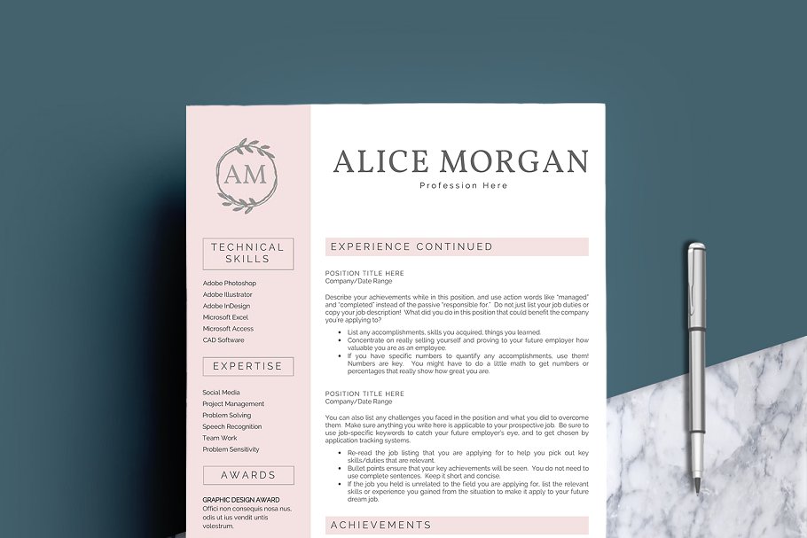 这个专业的简历模板正是你更新旧简历所需要的! 创意和时尚的同时,仍然是专业的,你一定会脱颖而出,用此简历模板。该设计是可定制的,所以您可以轻松地修改它,您可以简单地用您自己的信息替换填充文本并添加您自己的照片。我们专业设计的简历模板不仅能帮你节省时间,还能帮你整理招聘人员需要的所有重要信息,让你的简历看起来更专业。