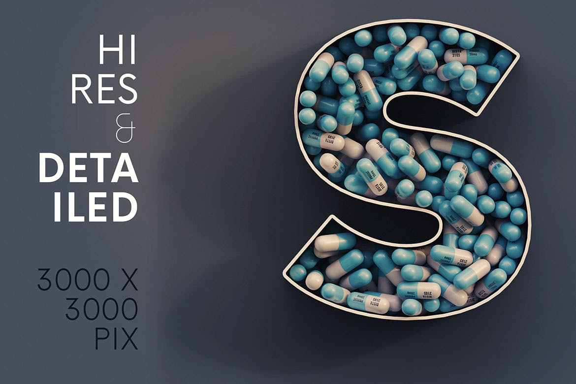这次老不湿分享的是,高端时尚3D立体药品字体设计,高分辨率和逼真的3D医疗和盒式字体中的药丸效果图(3000×3000像素-但字母尺寸稍小)。非常适合您的页眉,海报,广告–网络或印刷品。