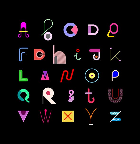 这次老不湿分享的是,炫彩装饰艺术矢量英文字体集合-AI,EPS,JPG,PDF,PNG,PSD,SVG,装饰字体矢量设计。在黑背景隔绝的色的抽象字体设计。抽象的几何形状形成的字母。