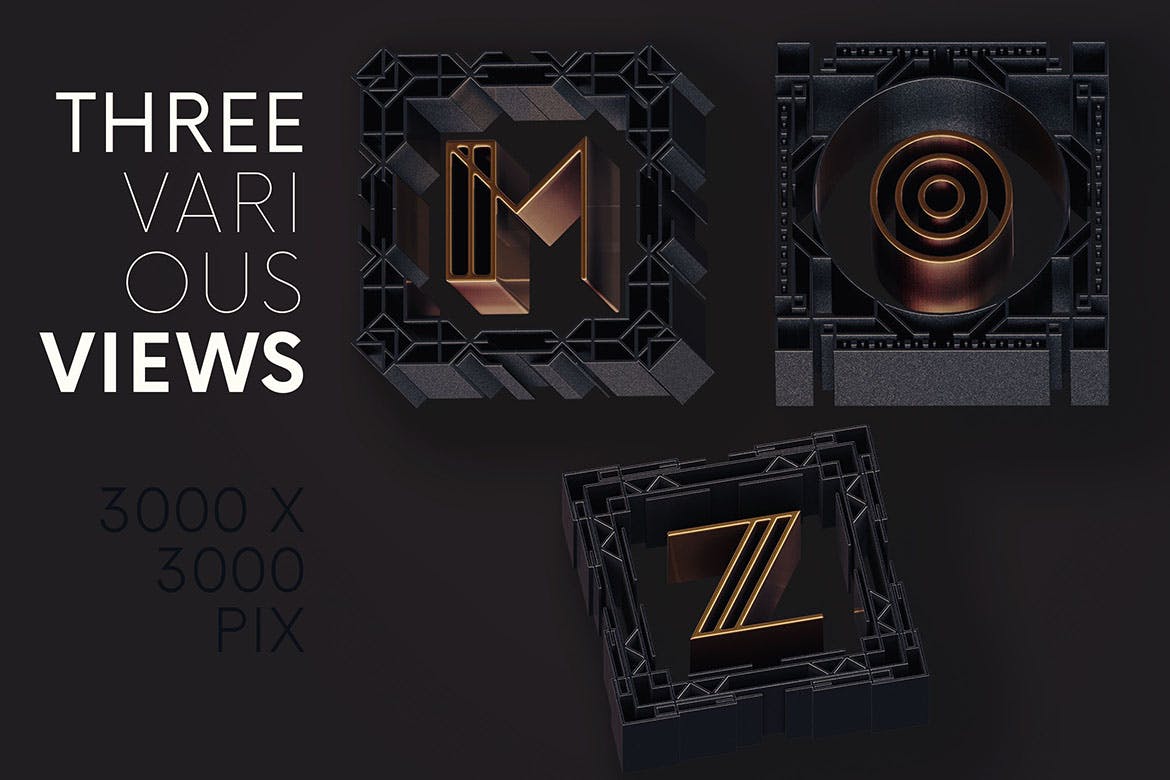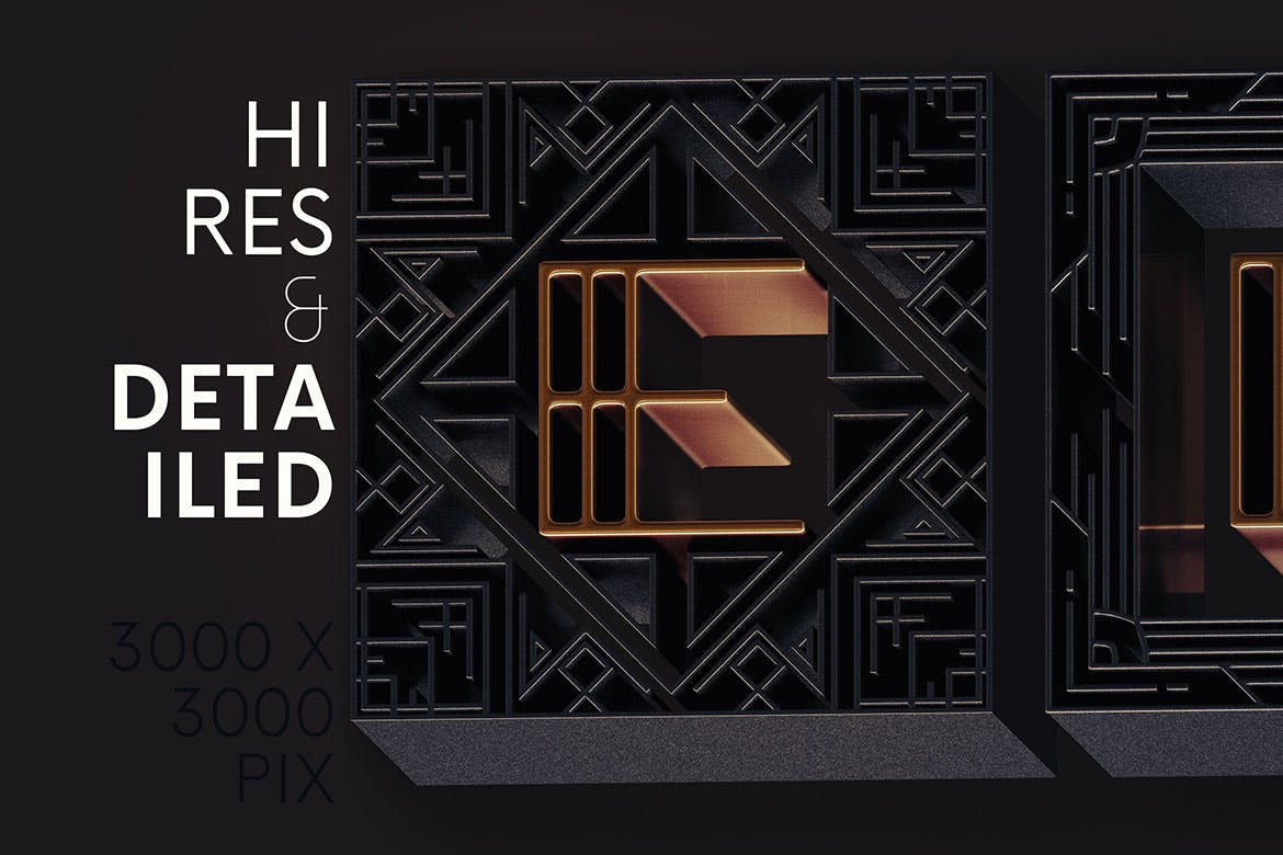 这次老不湿分享的是,时尚高端奢华震撼的3D立体Artdeco风格英文字体,高分辨率和逼真的3D艺术装饰,几何,建筑或复古方形装饰风格的字体渲染图(3000×3000像素-但字母尺寸稍小)。非常适合您的页眉,海报,网络或印刷项目。