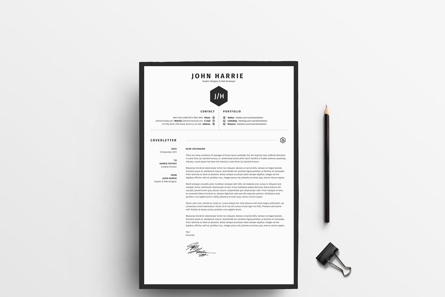 这个简历非常干净,是一款具有创造性、高质量和专业的设计模板。节省你的金钱和时间,给你的老板留下深刻的印象!包含一页简历和一页求职信。