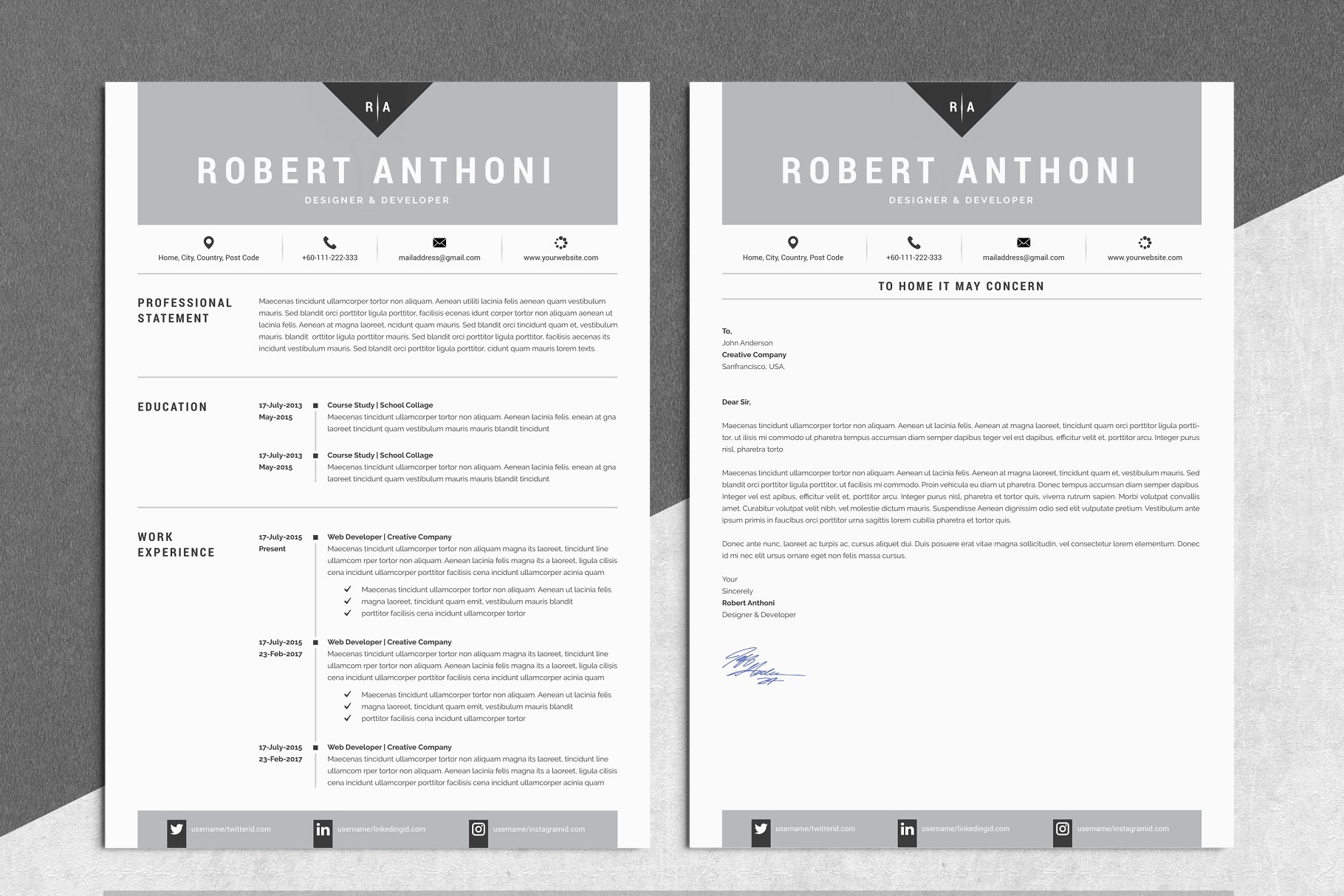 这组模板将帮助您在申请您梦想的职业时留下深刻的印象,您将收到4个独特的页面,包括:2页简历模板,1页参考资料和1页求职信模板。