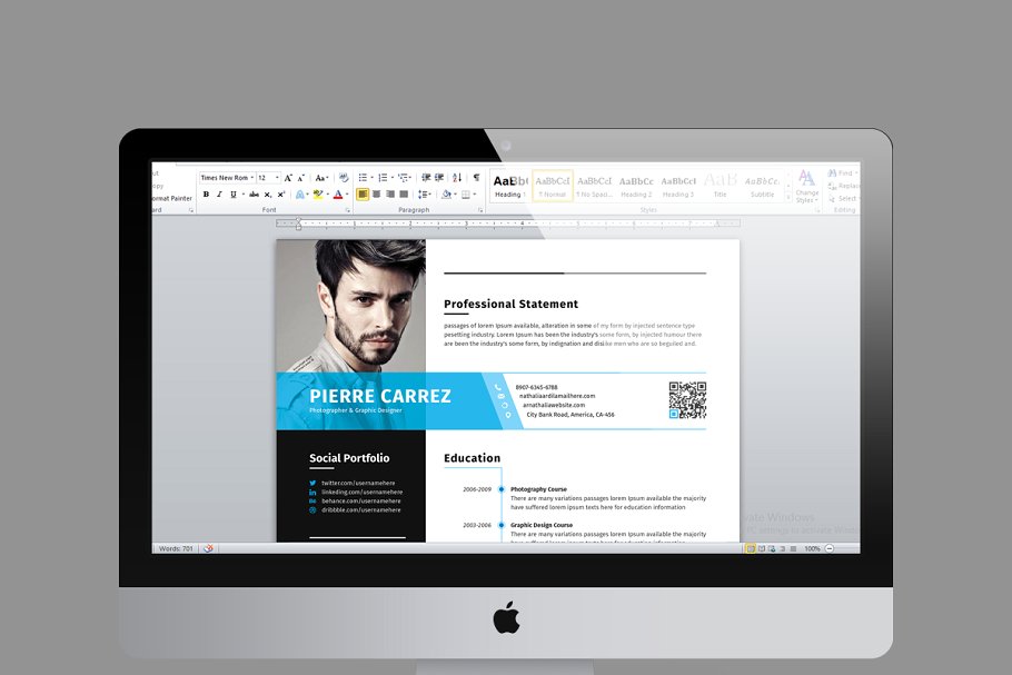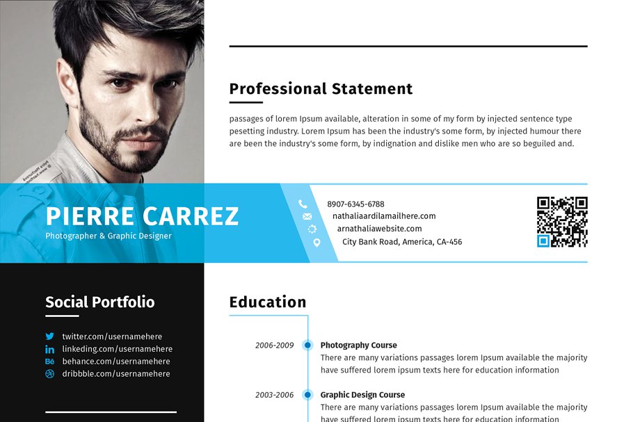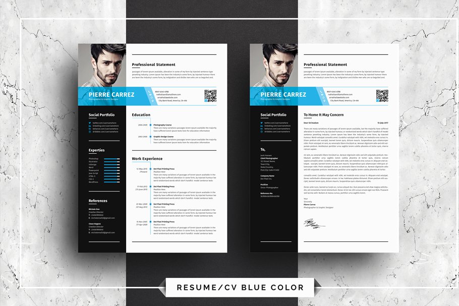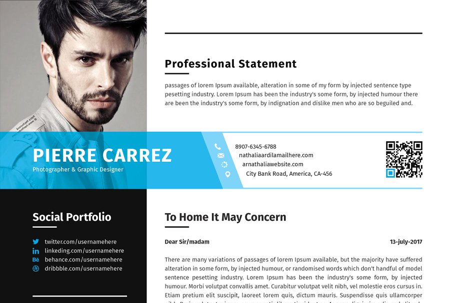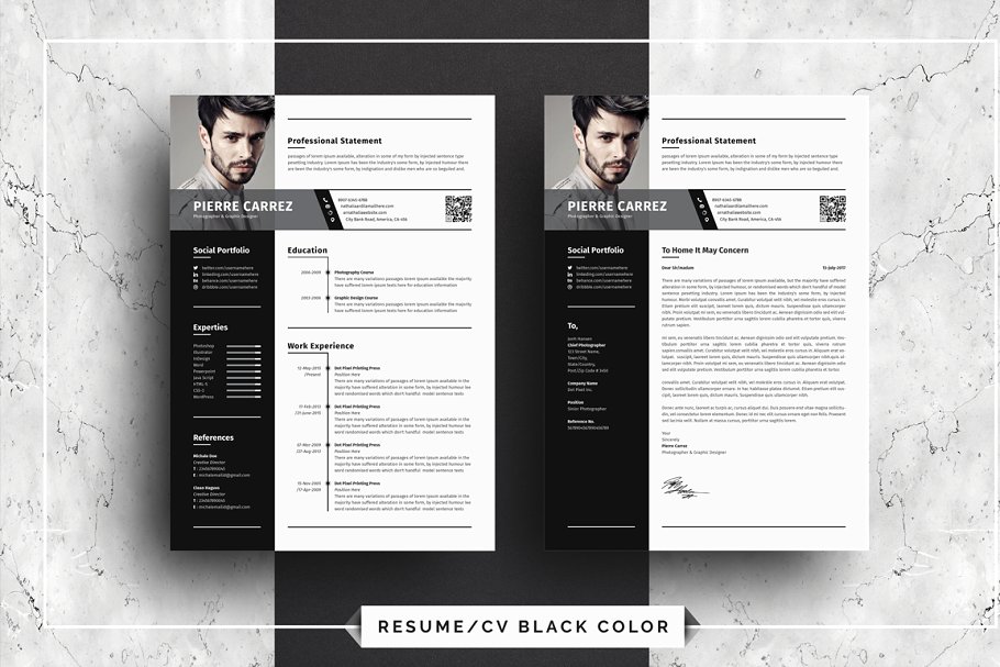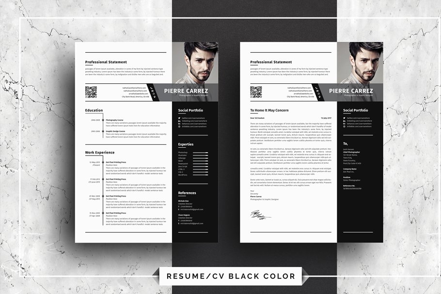 这是一款非常干净、有创意、现代、高级、专业的现代化简历设计模板。一页简历和一页求职信。文本、字体、颜色和所有元素100%可编辑和定制。