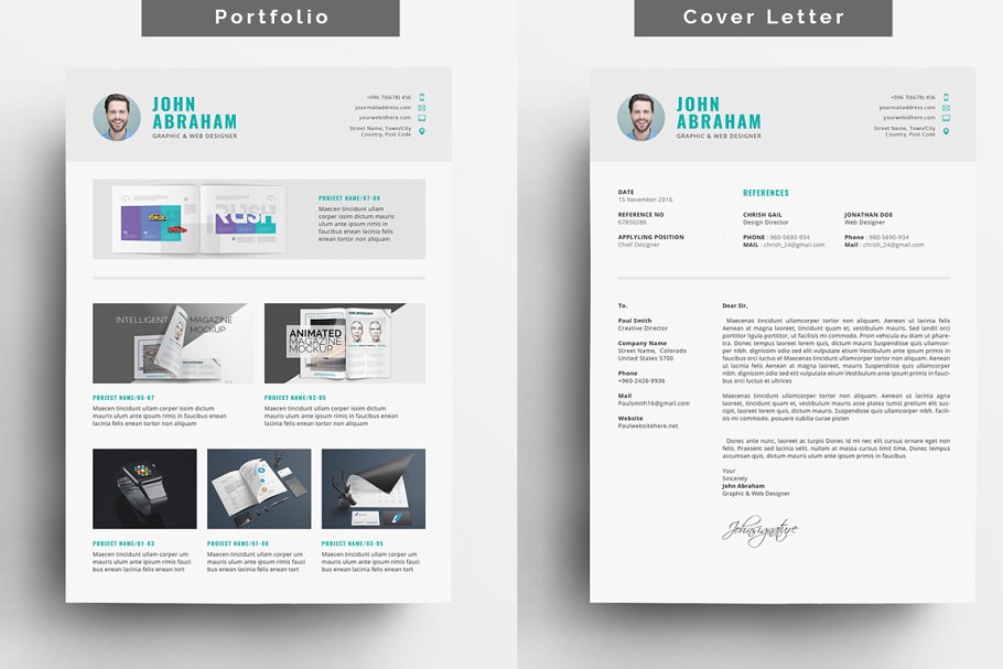 信息图表简历是非常干净、有创意、高质量和专业的简历。两页简历,一页求职信和一页作品集页。文本、字体、颜色和所有元素100%可编辑和自定义。 A4纸大小。CMYK 300DPI四色专色设计。