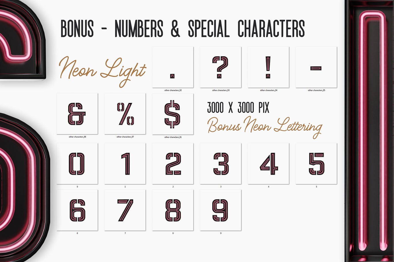 如果你正在寻找一些现实的霓虹灯风格的文字和图形元素,那么你是在正确的地方,因为在这里你会得到一个伟大的三维风格的文字集。这些图形是在高分辨率的透明PNG,所以所有都是伟大的新网页设计或任何打印设计项目。享受;)