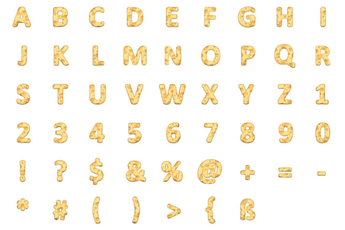 这次老不湿分享的是,时尚高端奶酪芝士3D立体英文字体字母集合(png),它非常适合一些创意厨房故事或游戏。如果您在处理餐厅和美食的网站上工作,可能会有所帮助;)。