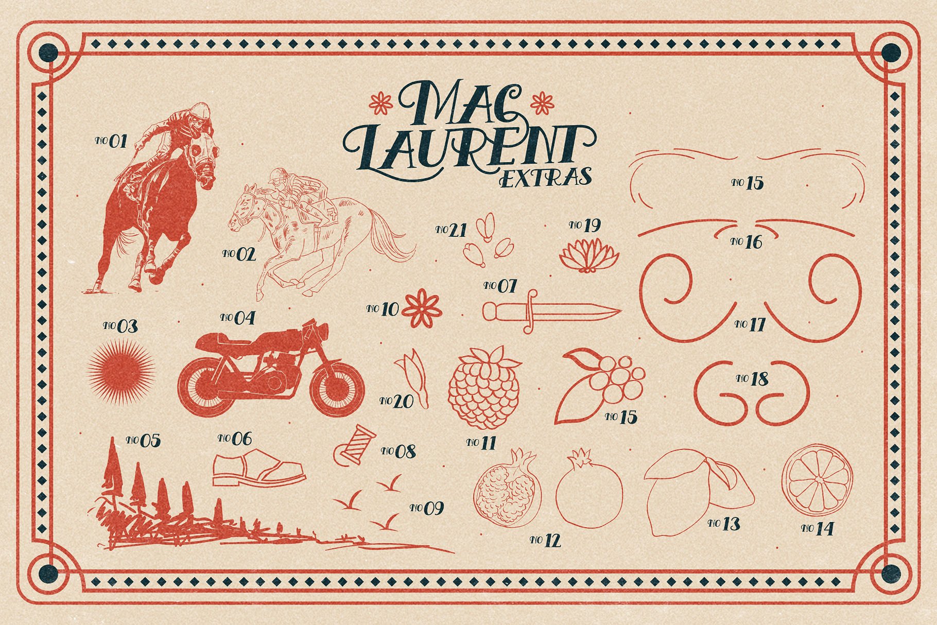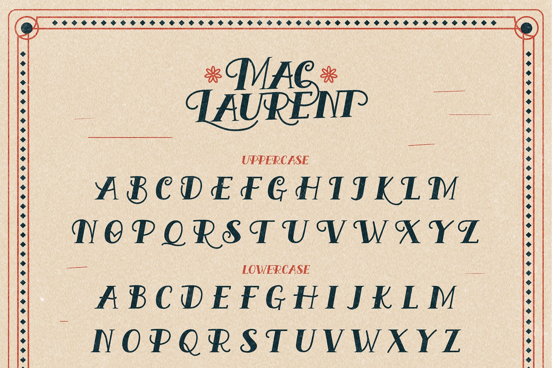 今天介绍一款经典字体,灵感来自于1940年的手写字体。字体适用于:标志、报价、邀请函、招牌、海报、贺卡、包装、标题、打印报价、封面相册等。为了帮助你做出令人惊叹的设计,Mac Laurent还附带了额外的图形元素。还不赶紧下载吗?