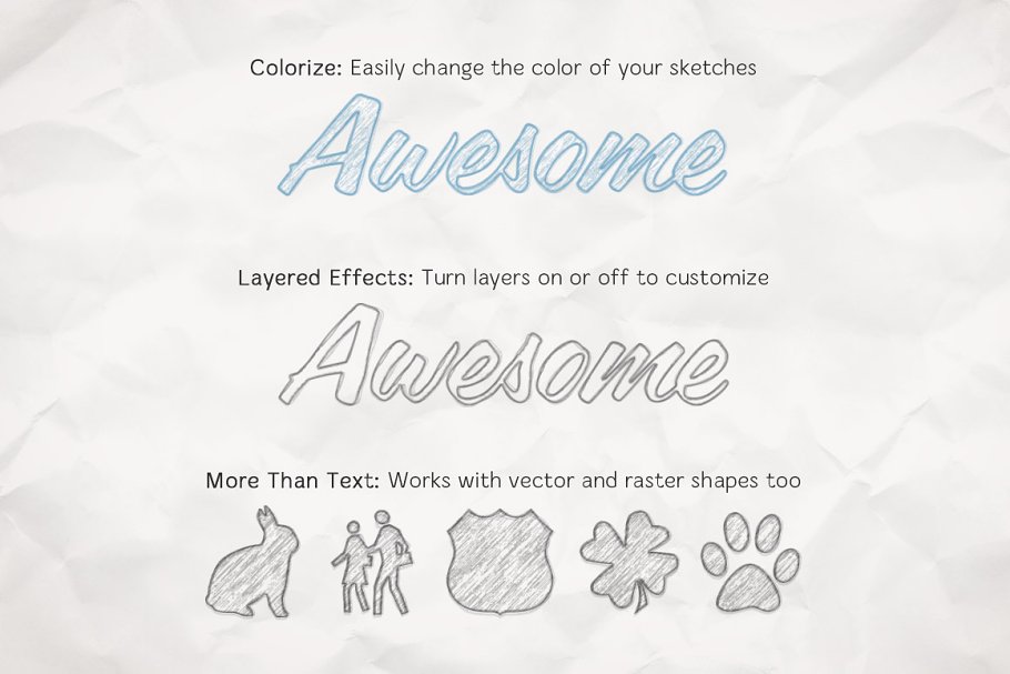 这个手绘素描效果让您可以添加一个真实的外观到您的文本和形状。只需通过更改文本或插入图形来编辑智能对象,这个模板将立即转换它。