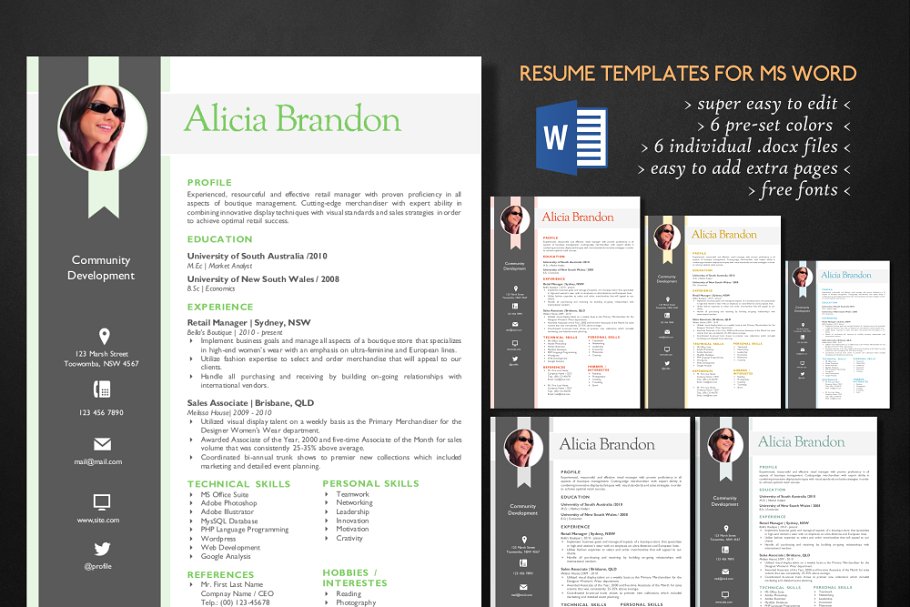 想要一份时尚的简历? 这个可能是给你的。Msword (.docx)的简历模板及其匹配的求职信。你将有六种不同的颜色主题简历和求职信模板。如果你想把颜色主题换成其他在这里没有的,这很容易做到。如果你能在MS Word中改变文字或形状颜色,那么你就能在简历模板中做到这一点。 在MS Word中,图形被转换为可编辑的图形。
