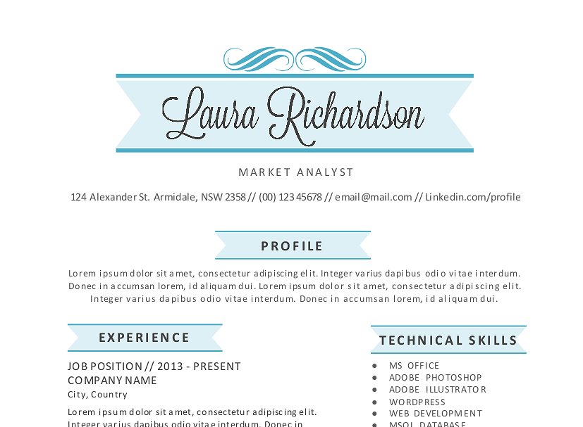 我现在向你展示了这一款Microsoft Word (docx)的一个时尚的横幅简历模板包。你的名字是用一个时尚的脚本与复古的横幅来制作的。每一个简历内容的标题也带有一个配对的横幅。你可以用MS Word编辑横幅的颜色。