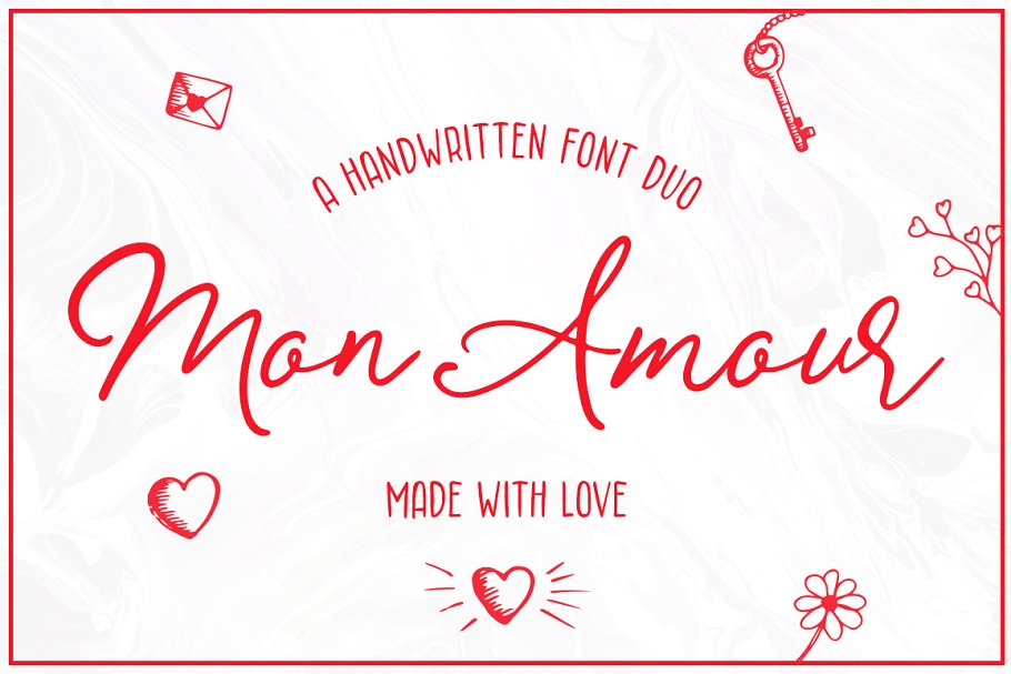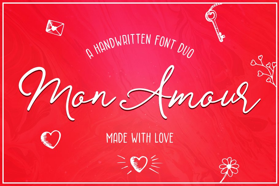 Mon Amour是一款由爱组成的手写字体组合。Mon Amor为西欧和中欧提供多语言支持。适用于餐厅、杂志、电话封面、社交媒体、贺卡、邀请函、婚礼、标题等等。这款手写字体组合有完整的大小写字符,大量的标点符号、连写、数字和替代文字。