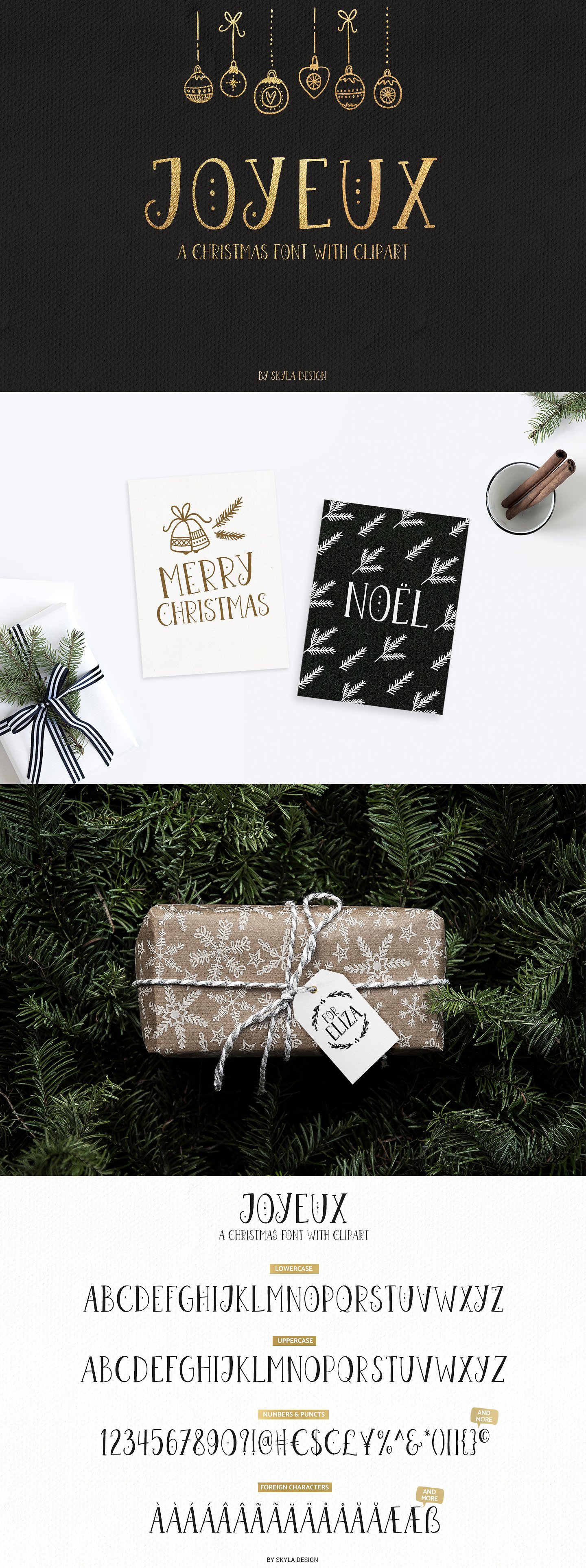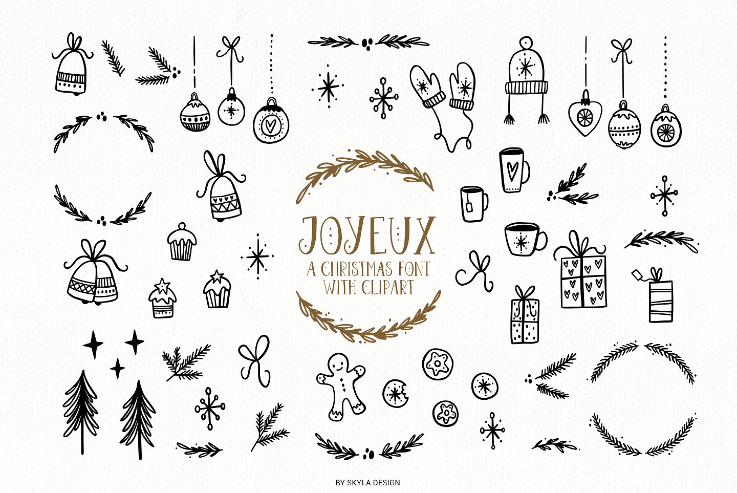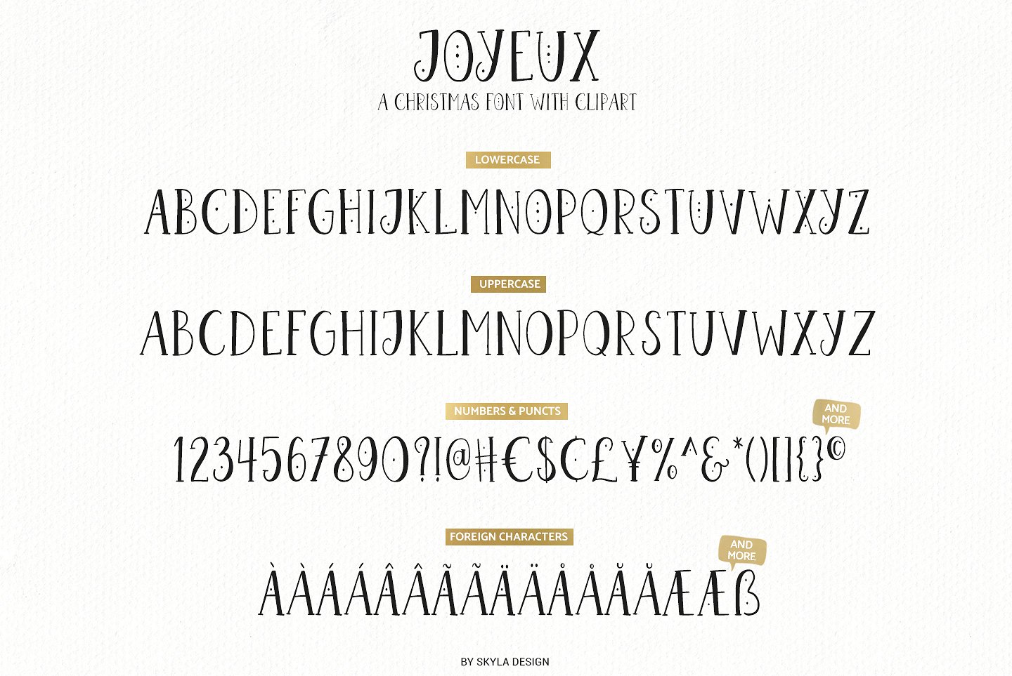 Joyeux是一个圣诞字体,带有52个可爱的剪贴画插图,这将使手工艺增加乐趣。Joyeux字体是一种全大写字体,包含标准字符、小写、大写、数字、标点符号和国际字符。