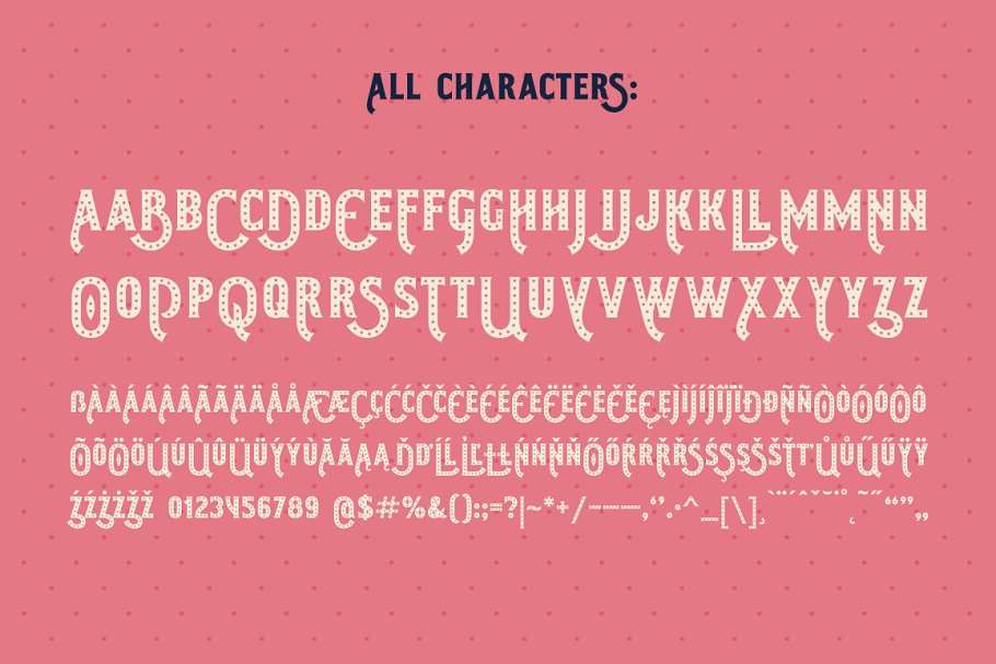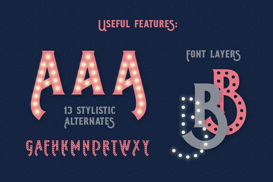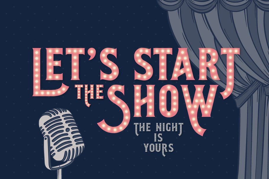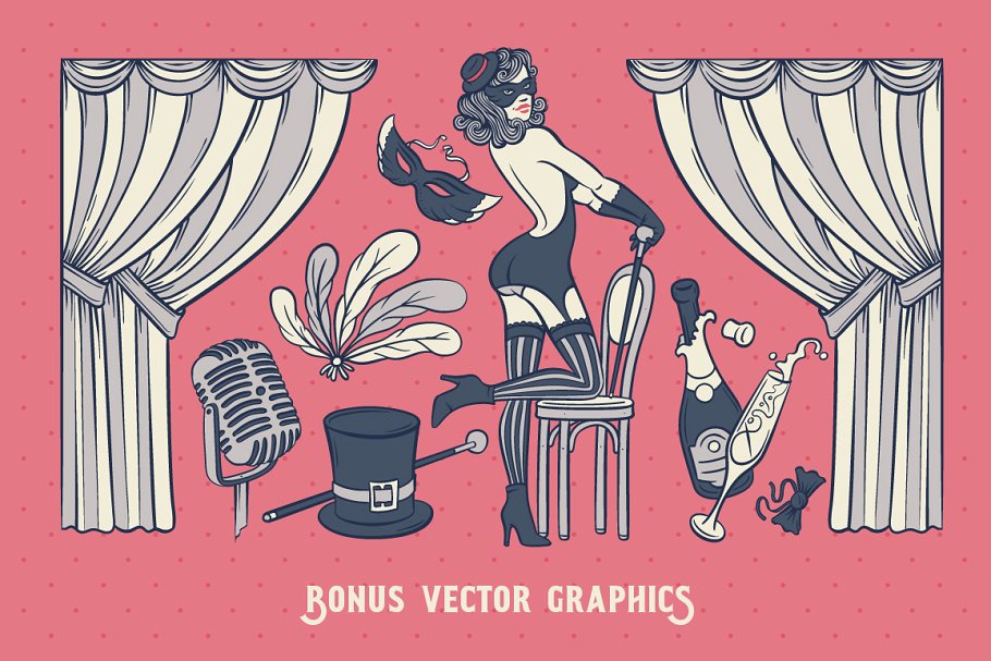 今天介绍一个复古风格的字体,与一个美丽的卡巴莱女舞者插图。这种字体有附加的字体文件,在基本的字形上有圆形的圆点,这样就形成了一个真正的卡巴莱招牌。