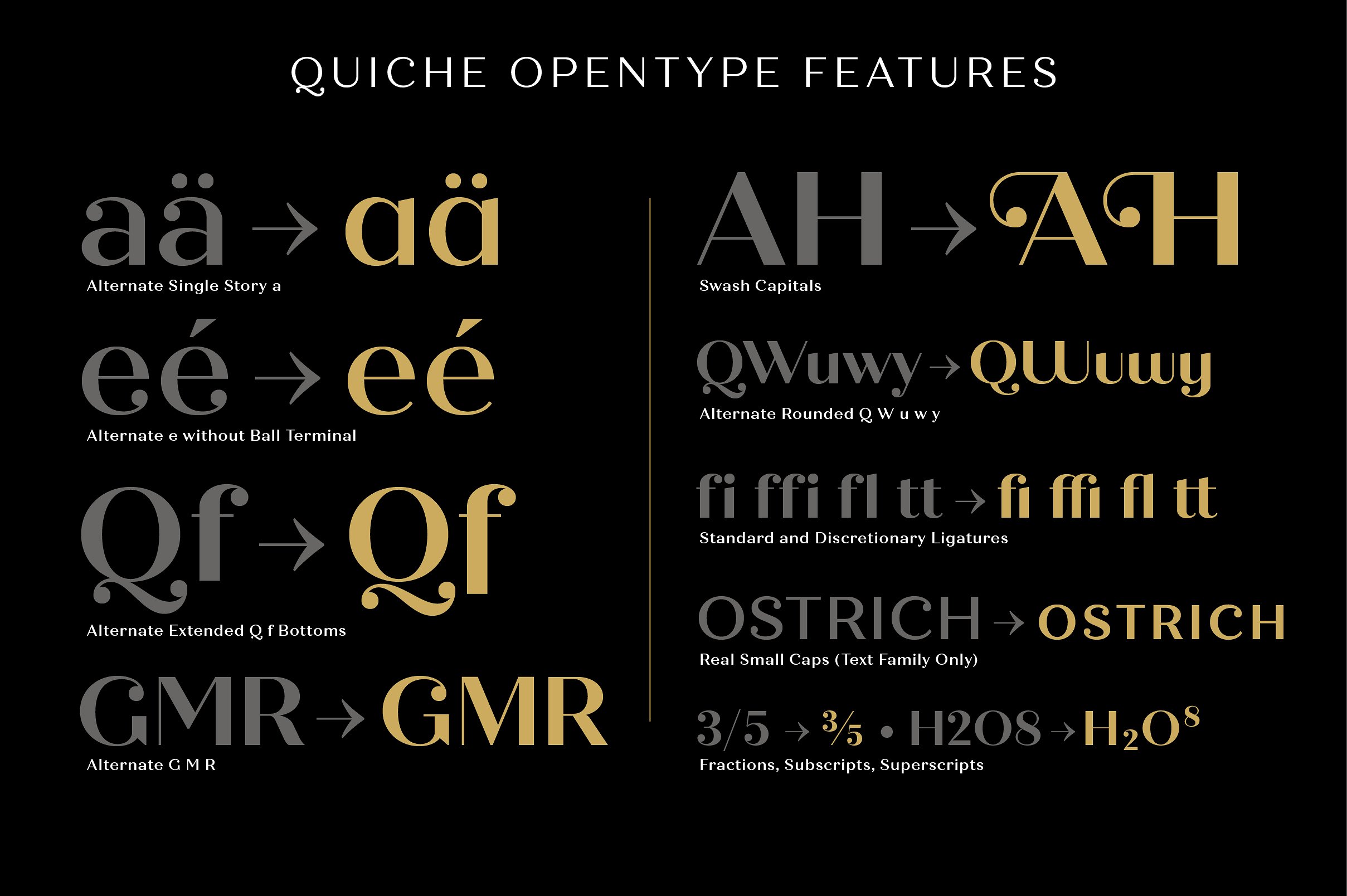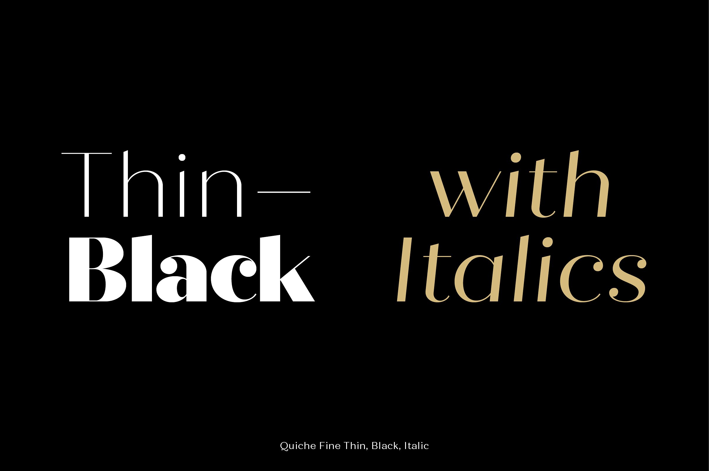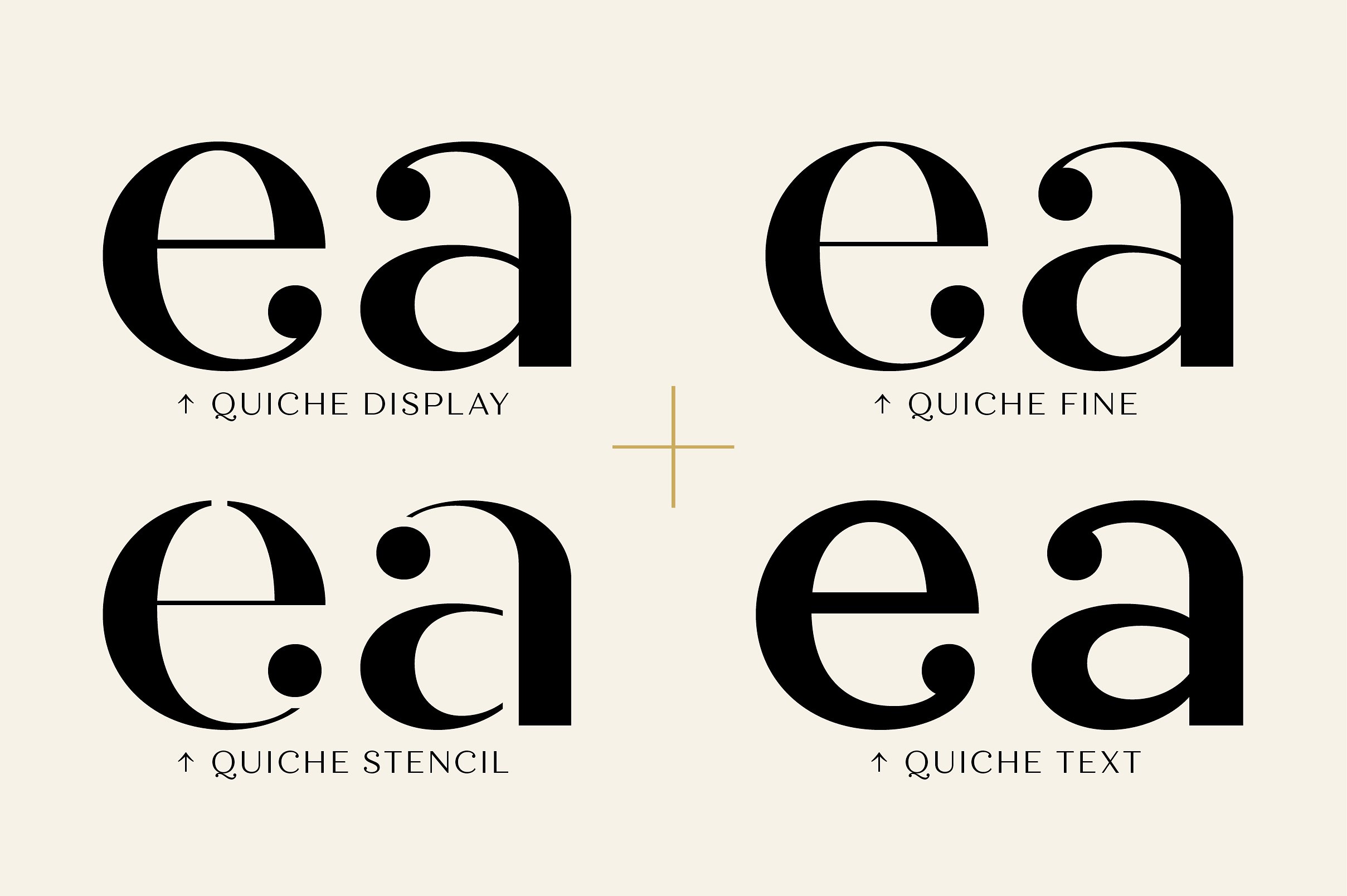 Quiche是一种高对比度的无衬线字体,具有滚珠端子和斜杆。根据需要,创建了显示、精细、模板和文本这4个子系列来协调工作。 字体的粗细从细到黑,再到与之匹配的斜体,字体可以用于多种应用:打印、网络、品牌、广告、杂志、产品、包装、标签等等。