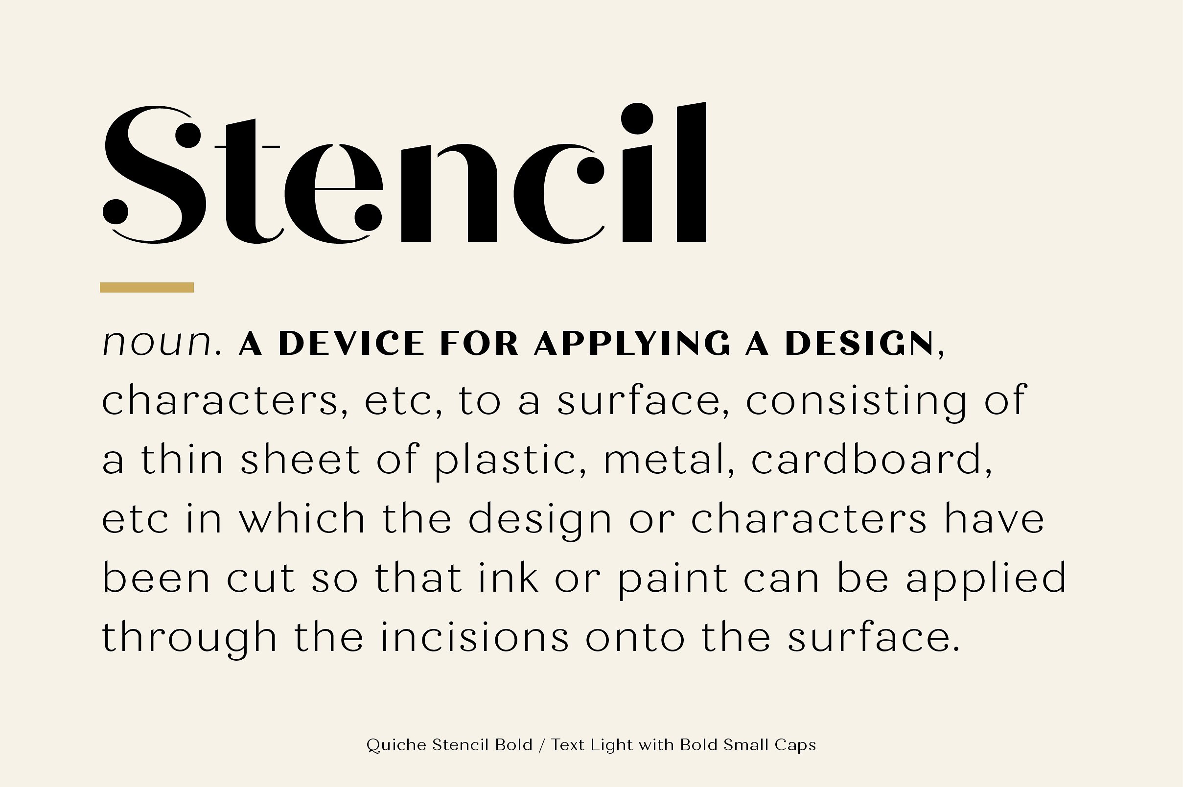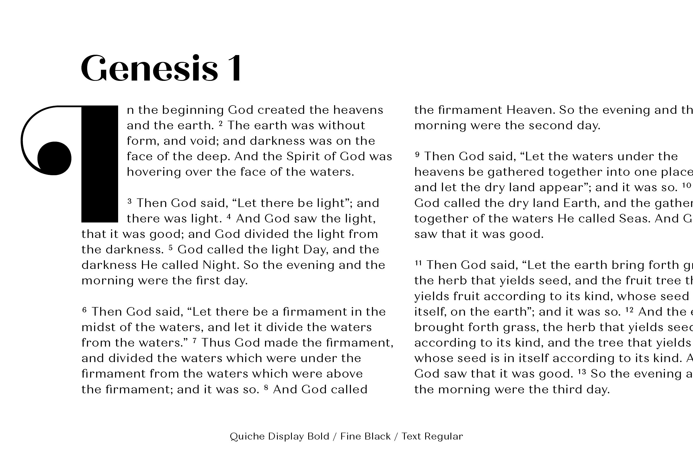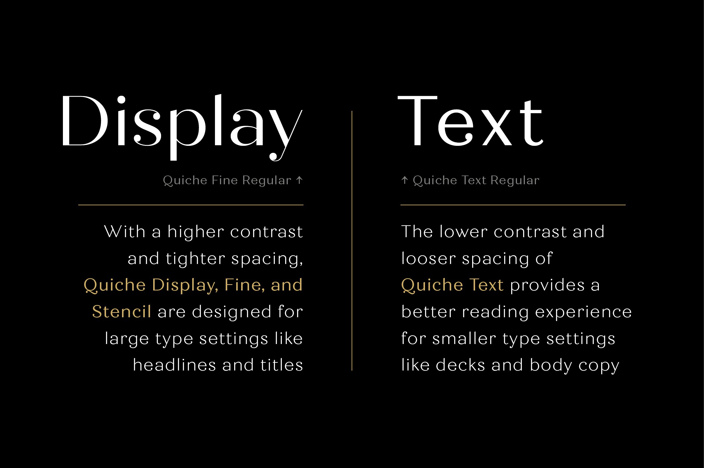 Quiche是一种高对比度的无衬线字体,具有滚珠端子和斜杆。根据需要,创建了显示、精细、模板和文本这4个子系列来协调工作。 字体的粗细从细到黑,再到与之匹配的斜体,字体可以用于多种应用:打印、网络、品牌、广告、杂志、产品、包装、标签等等。