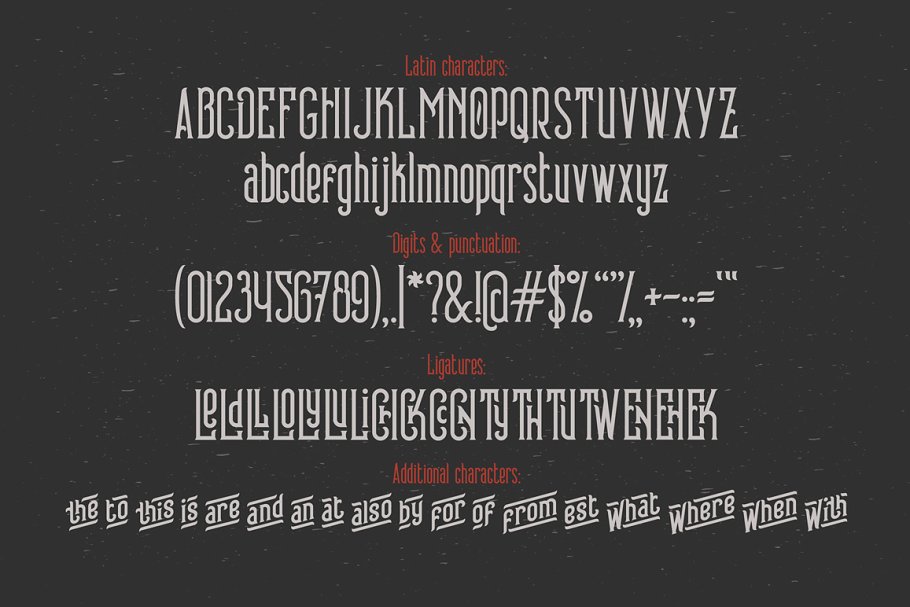 注意:字体有18种连接方式(如果在软件中启用此功能,大写字母将自动替换)。可以通过字形面板访问其他字符。字体只包含拉丁字符。