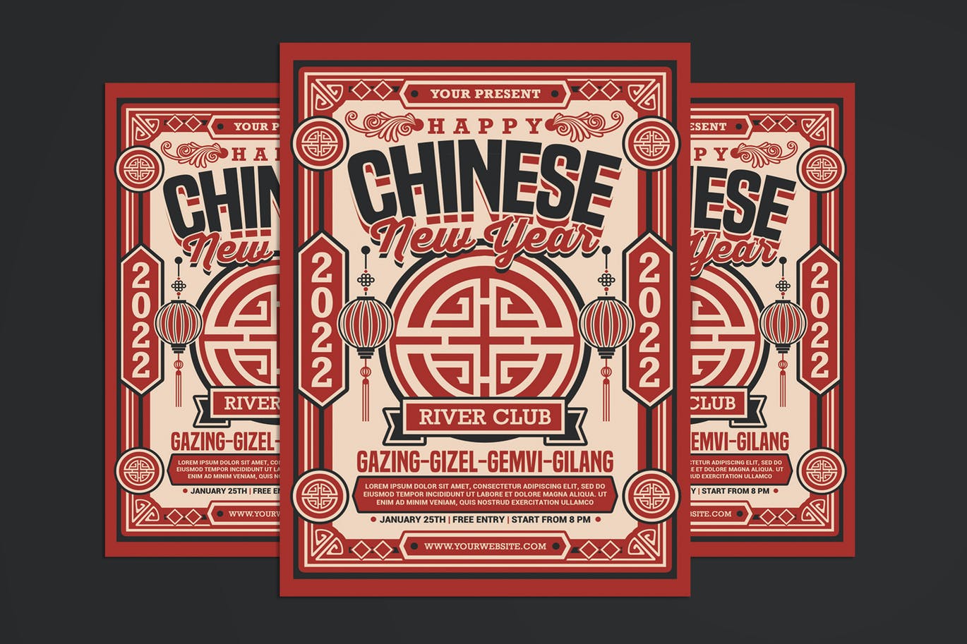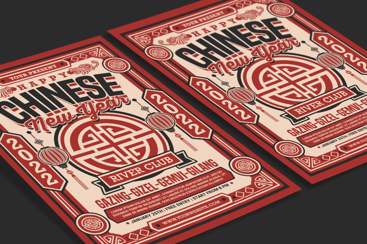 这是一个2022年春节主题的海报广告模板,可编辑文本、图像、颜色,传统中国风设计,可编辑文本与字体,易于改变颜色。