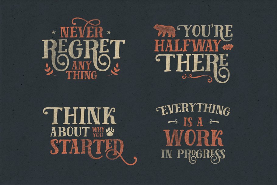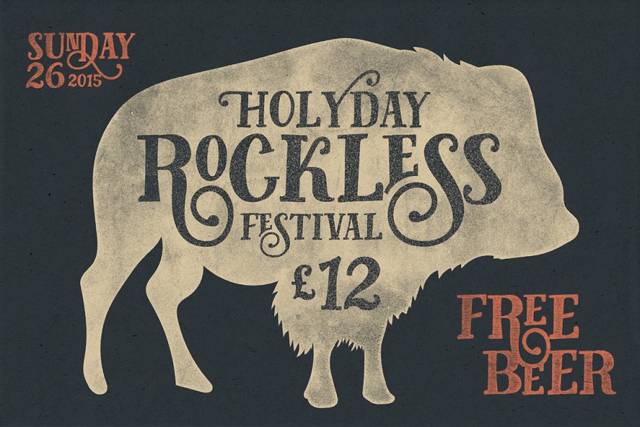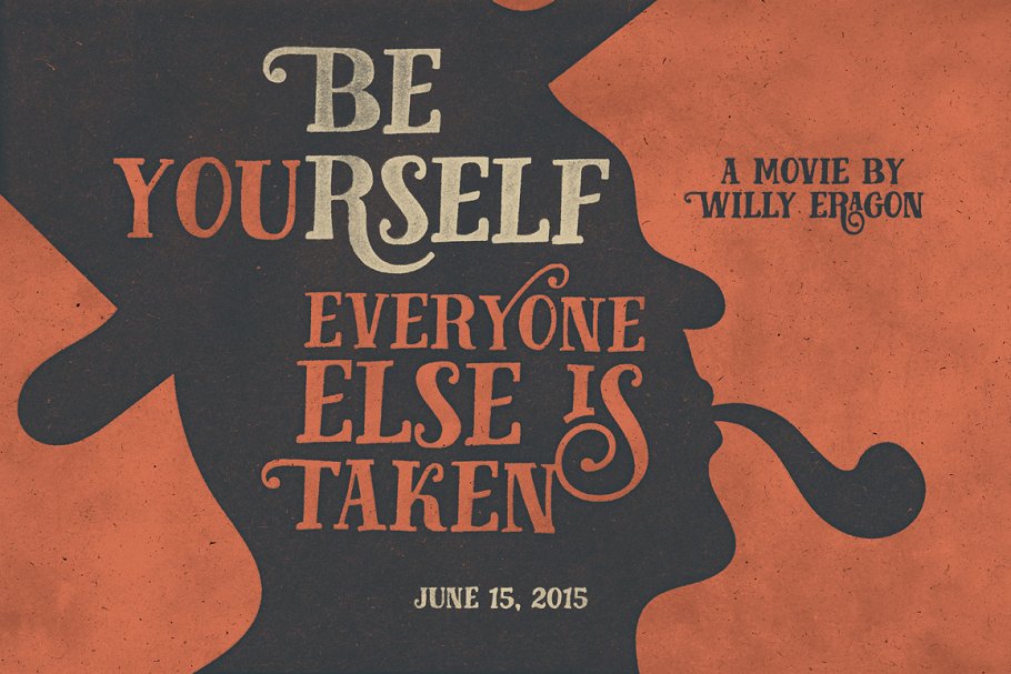 这是一种展示字体,灵感来自经典广告和电影海报。它也适用于其他用途,如标、,徽章、婚礼邀请函、贺卡等。结合高度复古的感觉和OpenType的功能放在一起,你可以很容易地为你的设计创建一个和谐的有吸引力的信息。