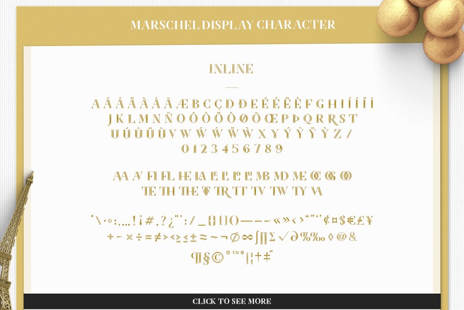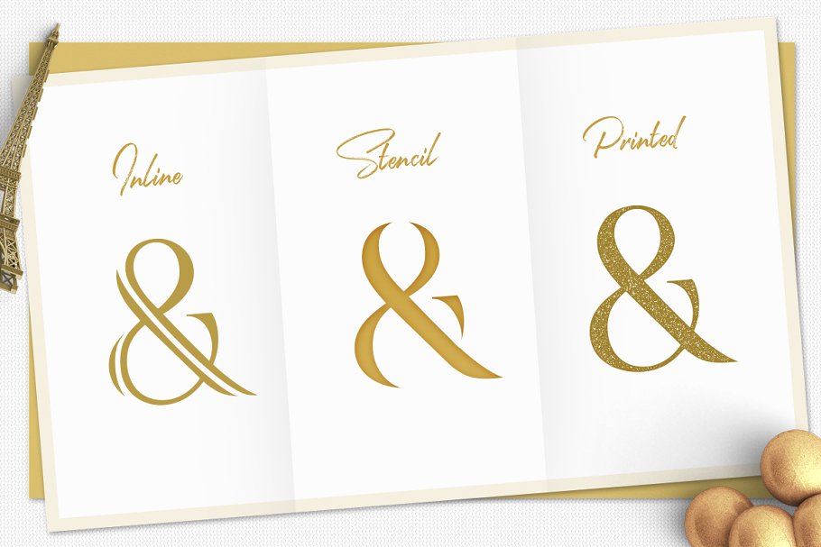 Marschel Display是为每一个对优雅、时尚和美妙事物充满激情的人而设计的。还提供您的需要,以创建一个高质量的设计,一个大的可读的标题, 最好是用在品牌上, 或者任何需要突出和完美的文字都可以在任何媒体上展示。Marschel Display有三种风格, 内联,钢网和印刷与大写、数字、标点符号、符号和独特的连接这将使你的设计脱颖而出,并带来迷人和不寻常的感觉,每一个都有自己独特的个性,以适应你追求的外观。适用于标题、杂志、标题、包装、t恤、糖果袋等平面设计。