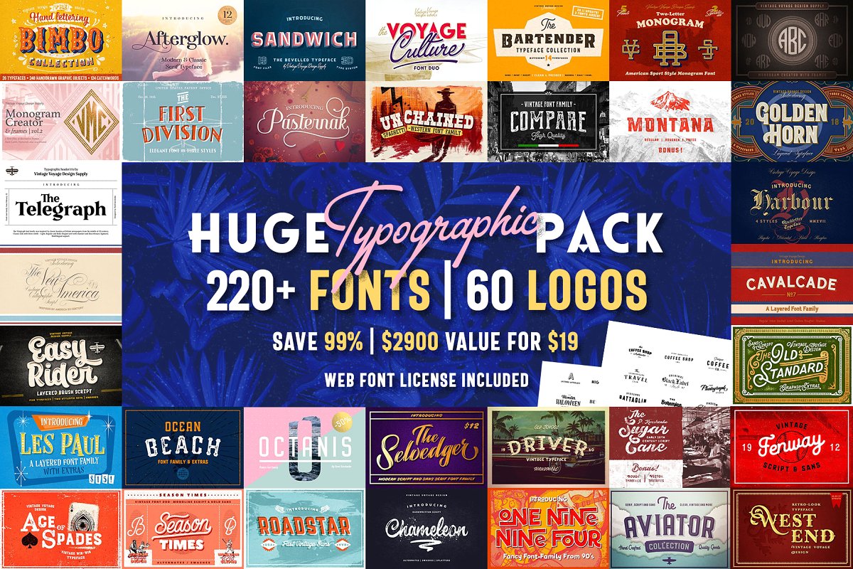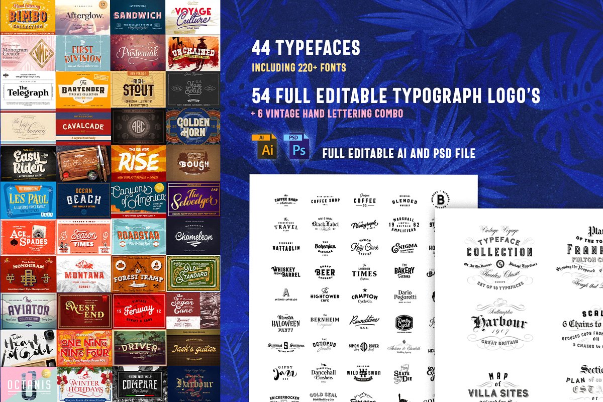 此款巨无霸套装包含包括221种字体和额外60个logo模板!有多种不同款式的字体类型,常规、浅色、粗体、衬线、无衬线等等。制作无限制的产品、转换为无限的浏览网页字体或在自由职业项目中使用。无论您的需求是什么,这个巨大的套装都能让您满意!