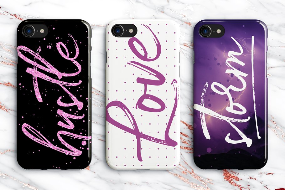 这种笔刷字体具有完整的大小写字符、大量的标点连接、数字和多语言支持。