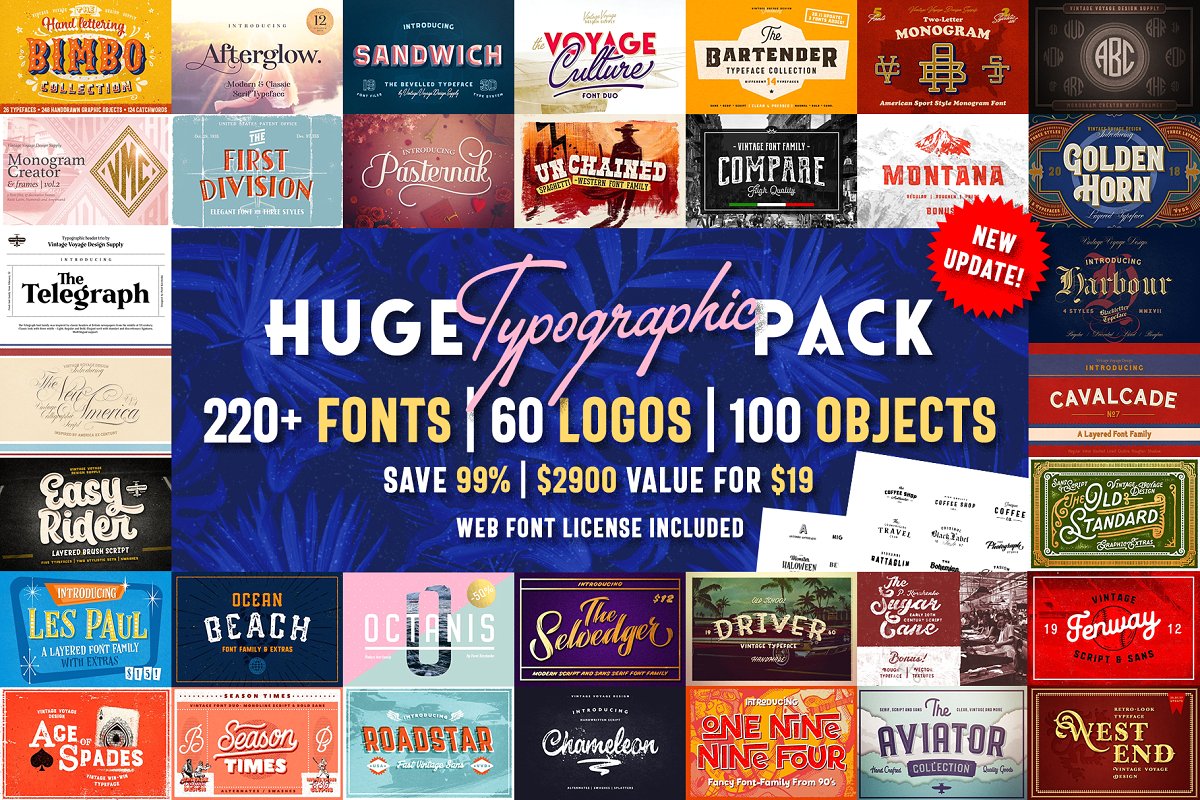 此款巨无霸套装包含包括221种字体和额外60个logo模板!有多种不同款式的字体类型,常规、浅色、粗体、衬线、无衬线等等。制作无限制的产品、转换为无限的浏览网页字体或在自由职业项目中使用。无论您的需求是什么,这个巨大的套装都能让您满意!