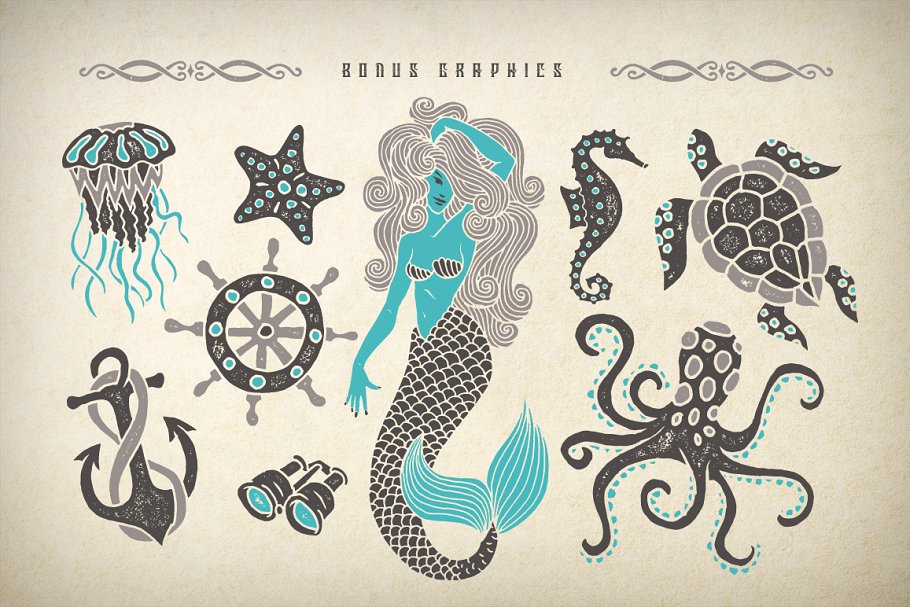 过来看一下这个“Marine Fairytale” 字体吧,复古的形状与粗糙的纹理,让它变得很独特。使用这种字体,您还将有一组插图与不同的海洋物体和生物。 此外,字体的简洁版本也包括在内。