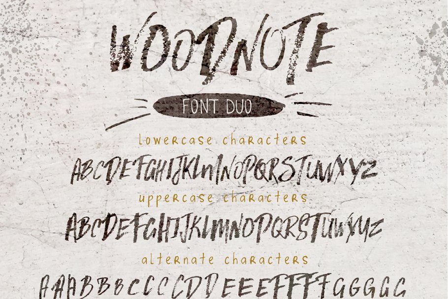 WOODNOTE是一种充满活力的炭笔手写字体。 粗糙的拉丝字体与温和的钢笔WOODNOTE轻字体搭配。WOODNOTE承诺增加排版的混乱和粗糙; 适用于标志、服装、报价、产品包装等等。