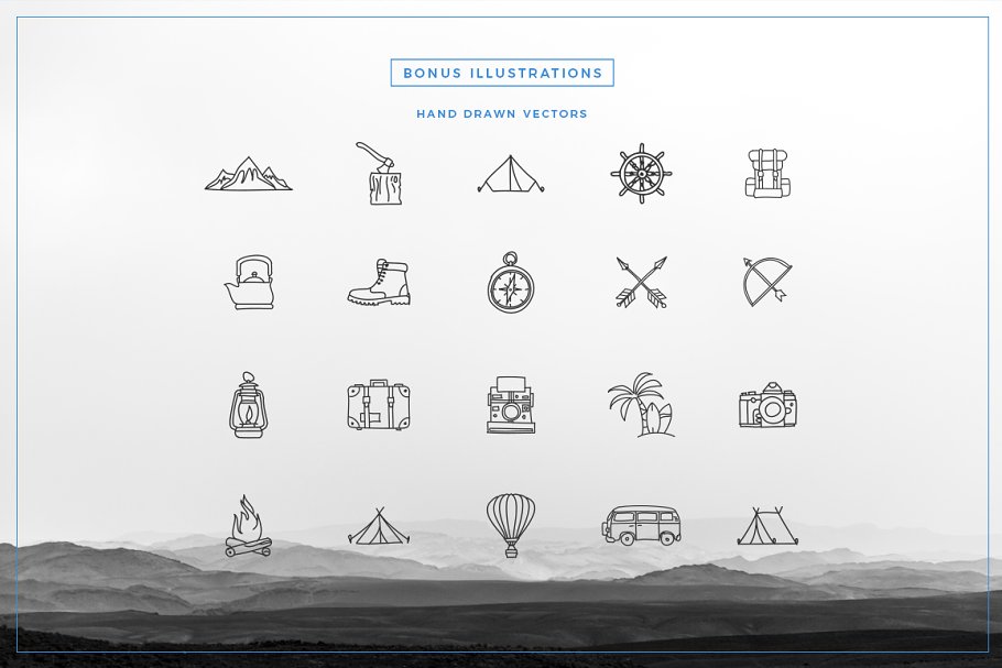 这是一个喜欢户外的类型地字体,但它不仅是为户外爱好者准备,任何人都可以享受这种冒险多用途的字体,作为常规和大胆的,也包一个伟大的时尚版和一个很酷的衬线!最重要的是,我们还包括20个额外的手绘矢量图标,你一定会喜欢的。