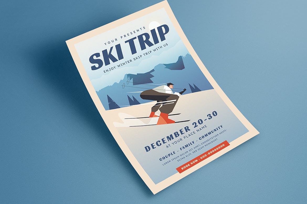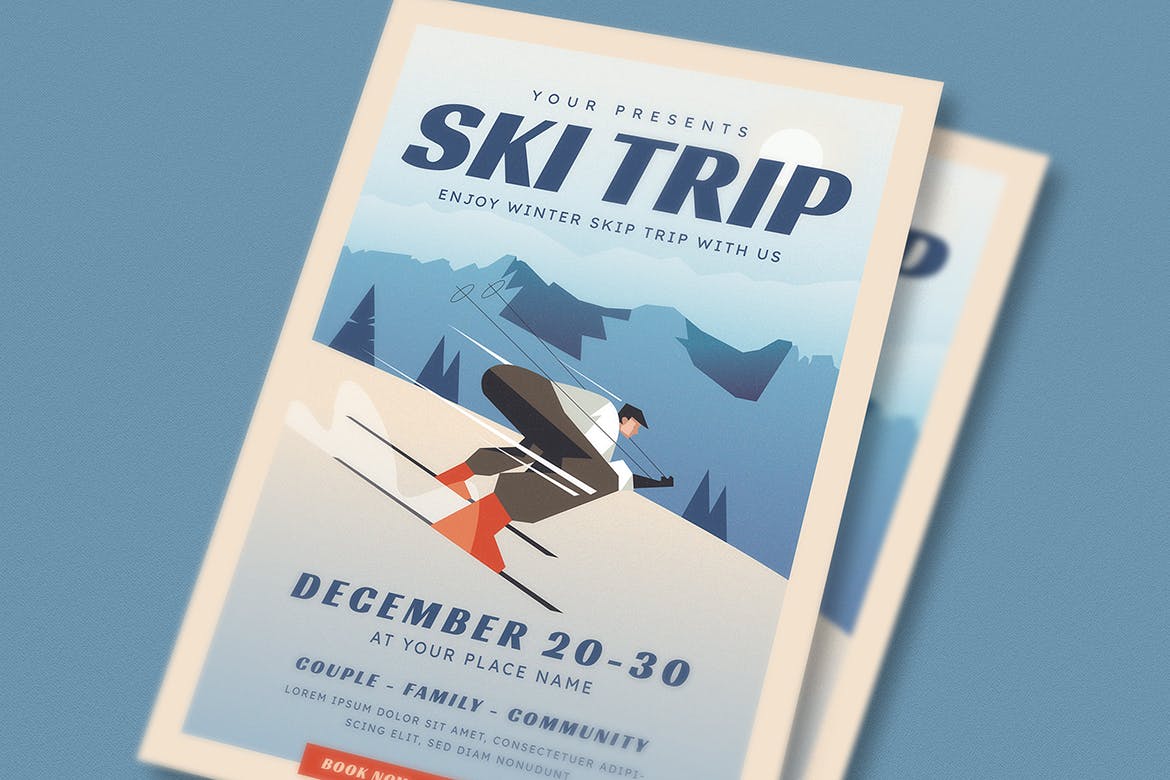 这次老不湿分享的是,清新时尚高端简约滑雪海报设计模板-AI,PSD,Ai CC 和 Psd 文件尺寸:8.27×11.69 大小,带出血,分辨率:300 dpi CMYK / 准备打印。