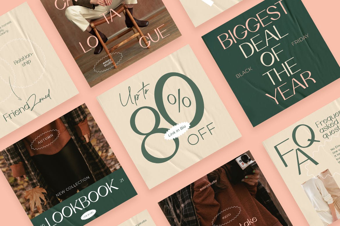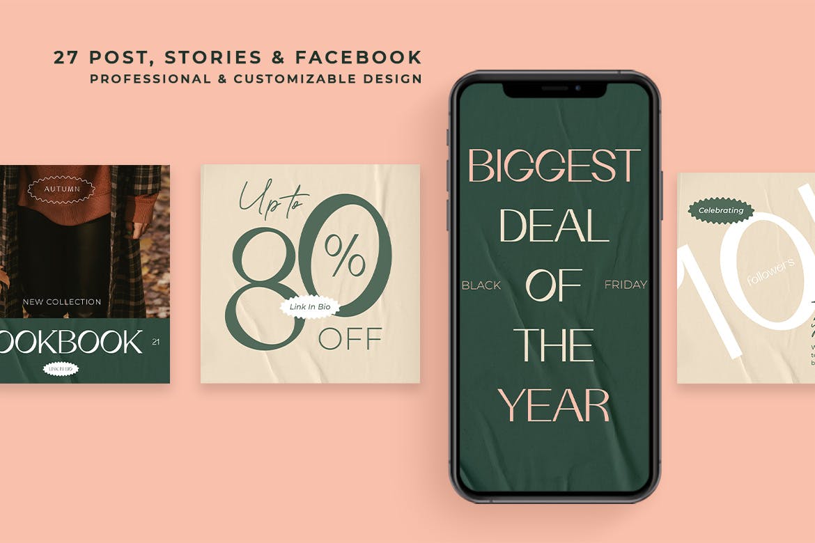 这次老不湿分享的是,清新时尚高端简约Instagram社交媒体banner海报设计模板集合-PSD,总共 27 个模板! Instagram 故事、POST 和 FACEBOOK 模板包含在一个包中!具有独特风格、优雅流行色调和优雅风格的现代设计。