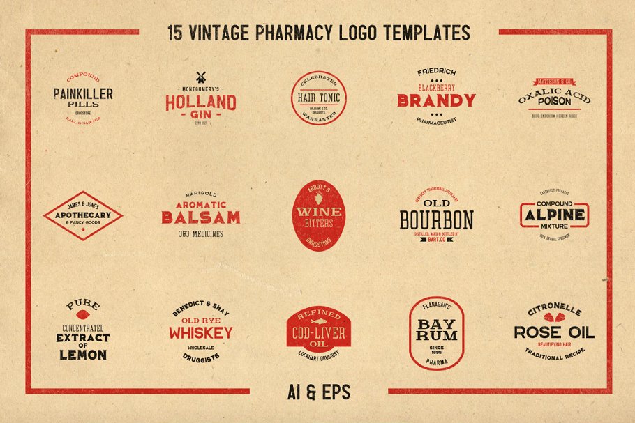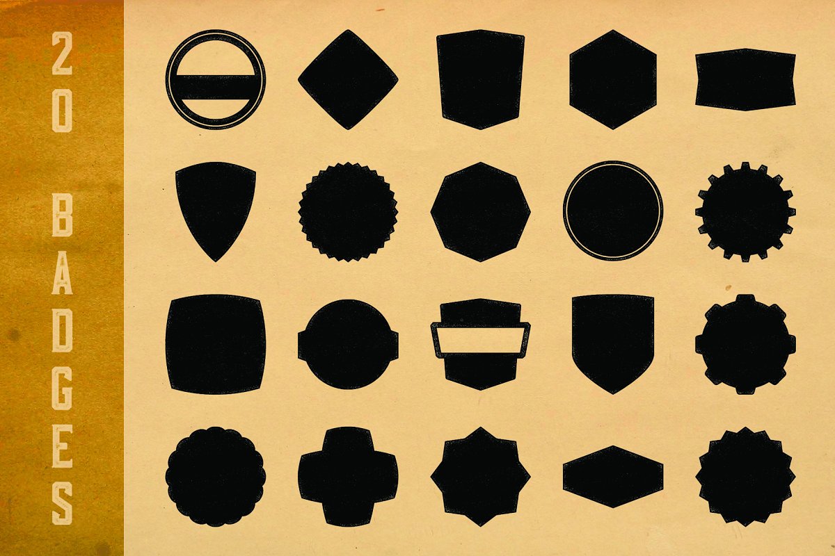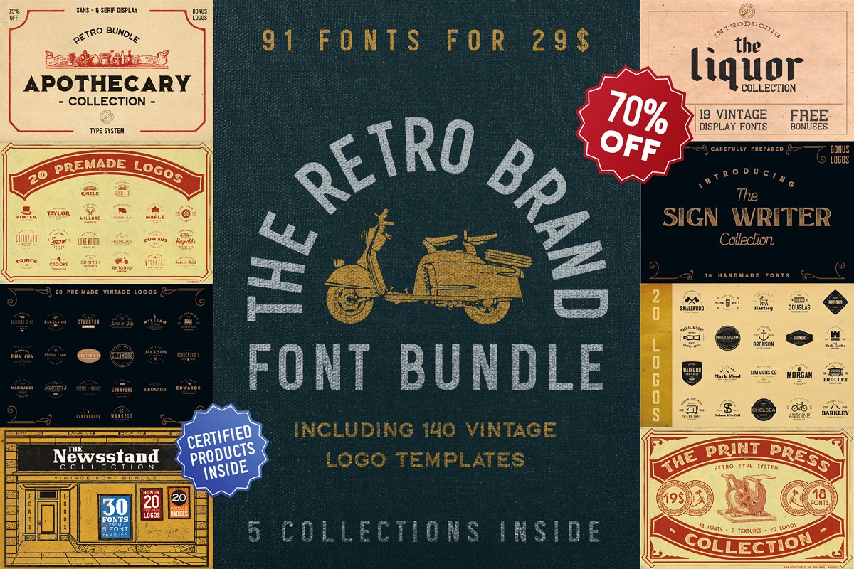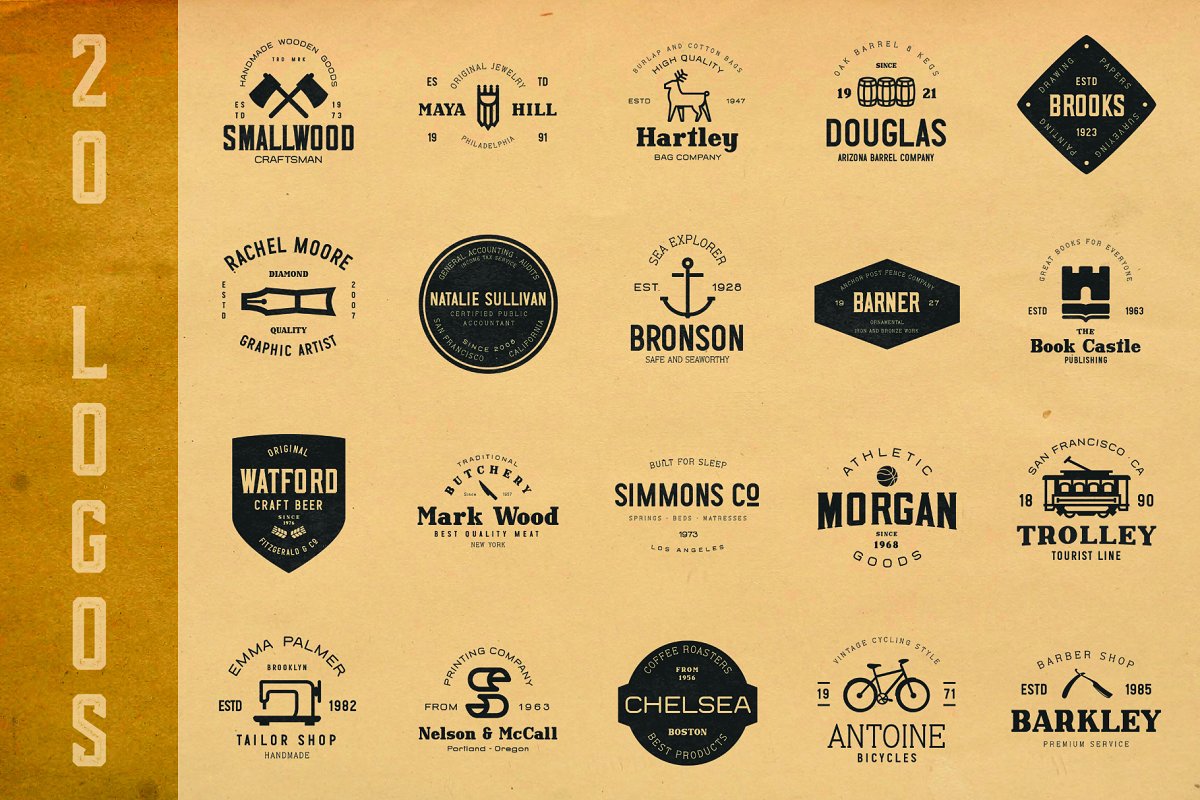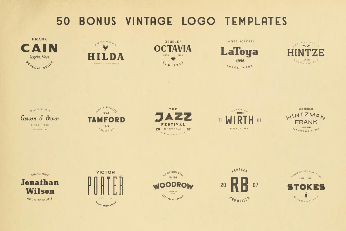 此套装包括所有5个字体集合+基于这些字体的50个独特的徽标模板。有很多种不同的字体样式,您一定能找到所需的字体。非常适合复古品牌设计和其他复古风格的项目!