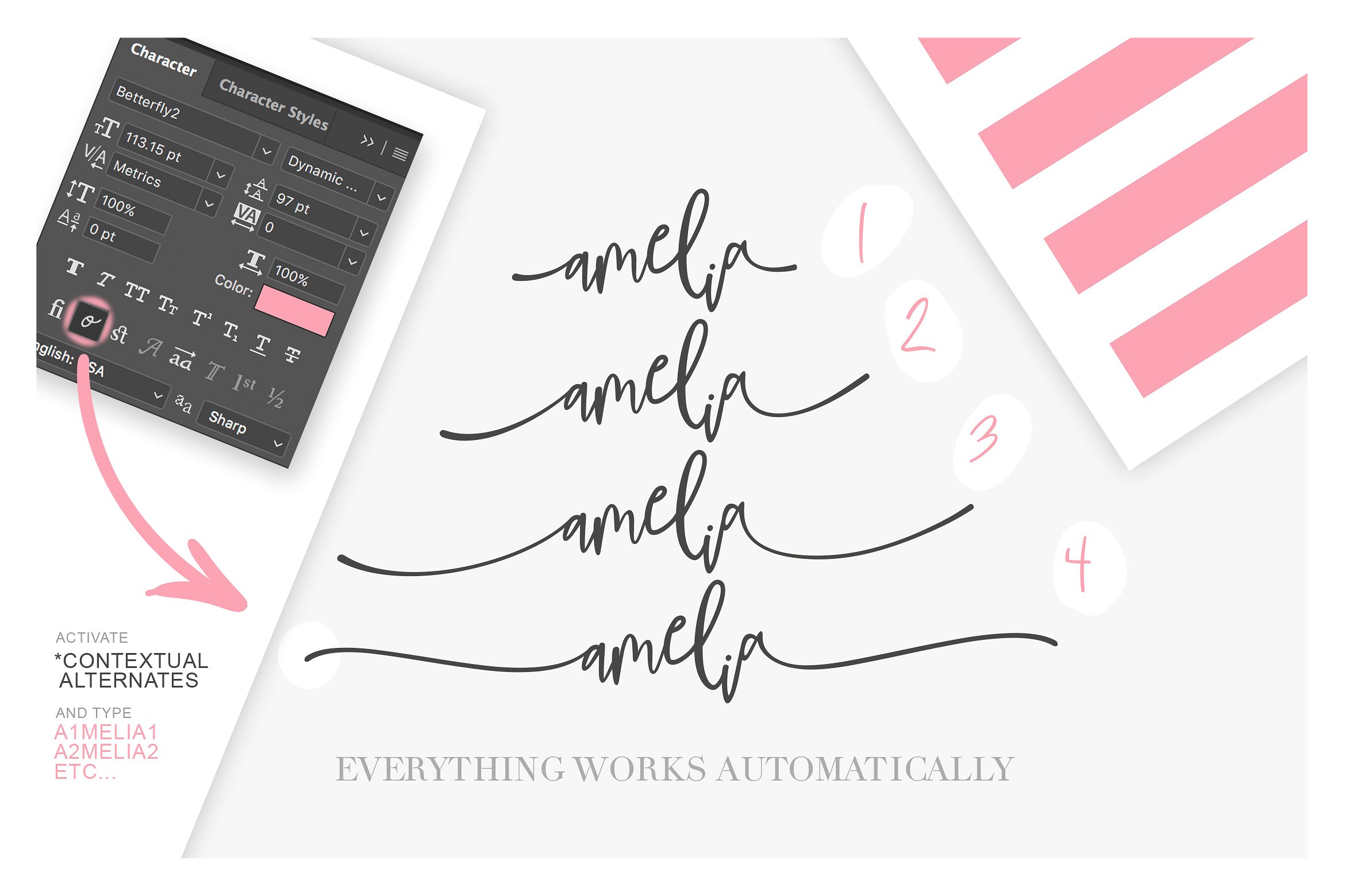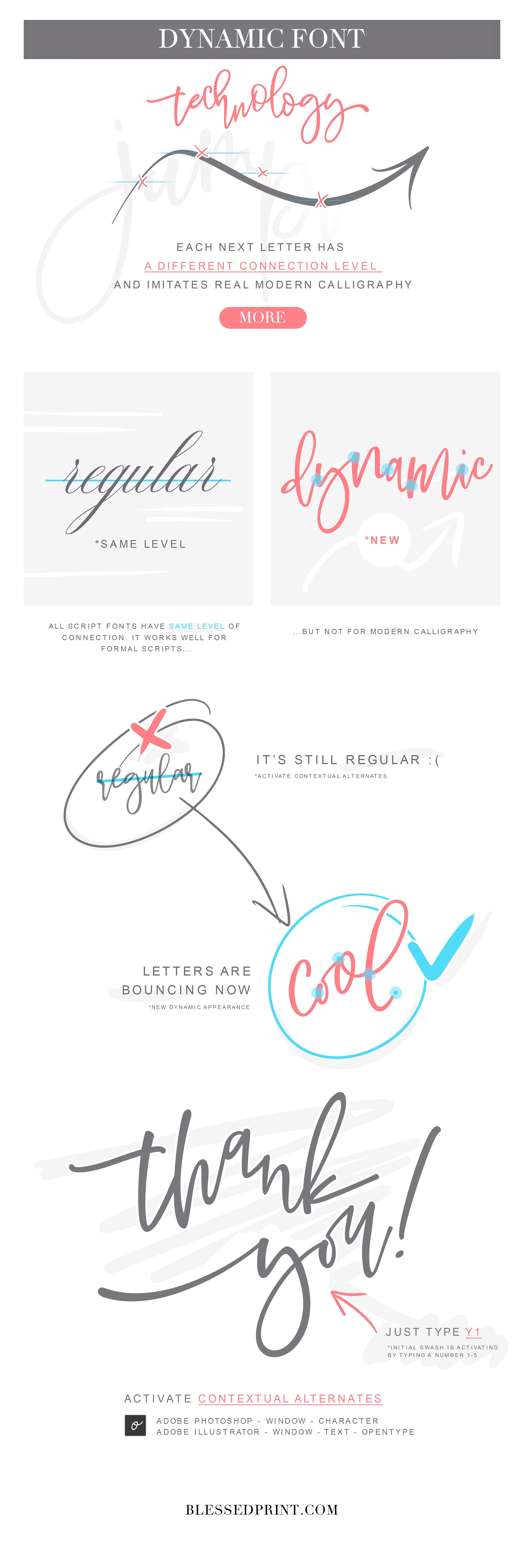 这组花体英文艺术字体不同于许多现代书法字体,它包含了一种“动态字体技术”,当您输入每一个字母都会自动更改其自身的基线,并连接下一个字母。