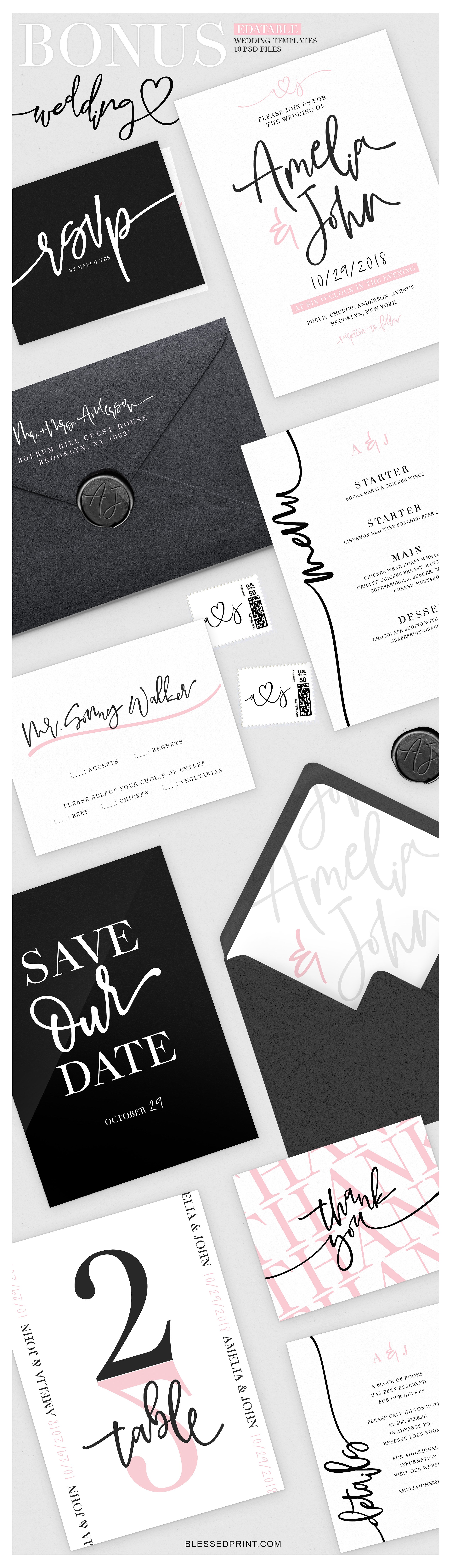 - 10个可编辑的PSD文件(婚礼请柬、回复卡、感谢卡、地址、表号、菜单、保存日期、邮票、详细信息卡)只需自
