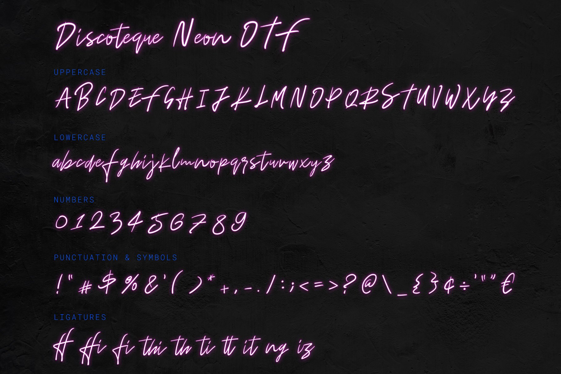 今天介绍这一款“Discoteque”书法字体和电子复古风格的字体。这个包包含了它的两个版本。其中一种是所有系统都支持的标准实体otf字体,另一种是彩色霓虹灯版本的开放式SVG字体。适用于艺术和现代字体使用的各种项目。霓虹灯版本是惊人的,并有一个现实的外观与辉光和阴影。