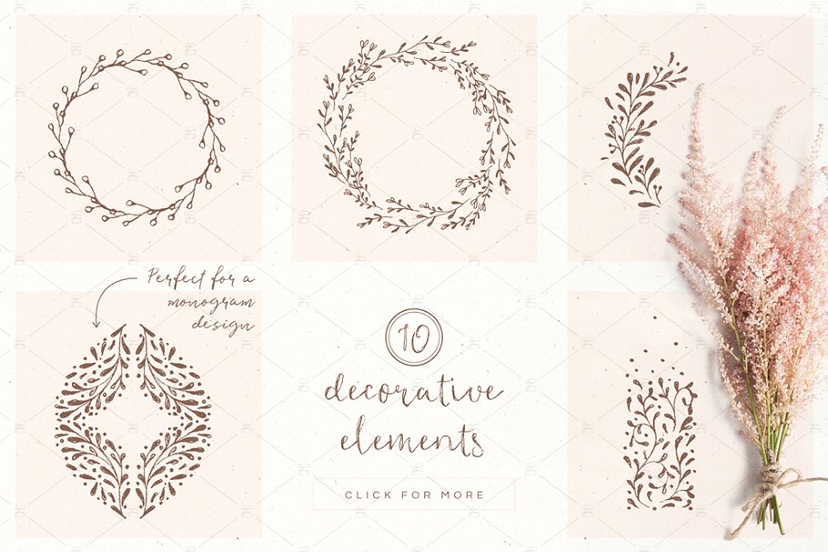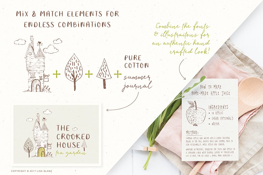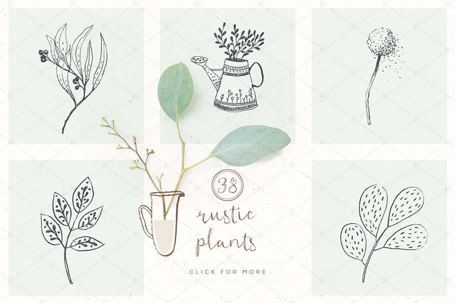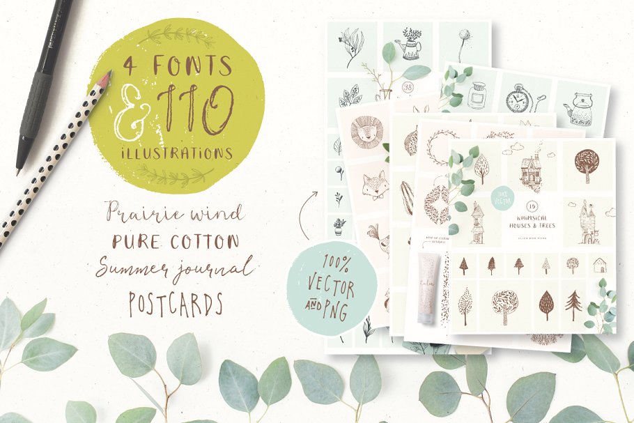 添加一个美丽的、手工制作的外观到您的工作。拥有4种独特的字体和110幅手绘插图,这个精心策划的收藏充满了乡村的美好。拥有4种独特的字体和110幅手绘插图,这个精心策划的收藏充满了乡村的美好。