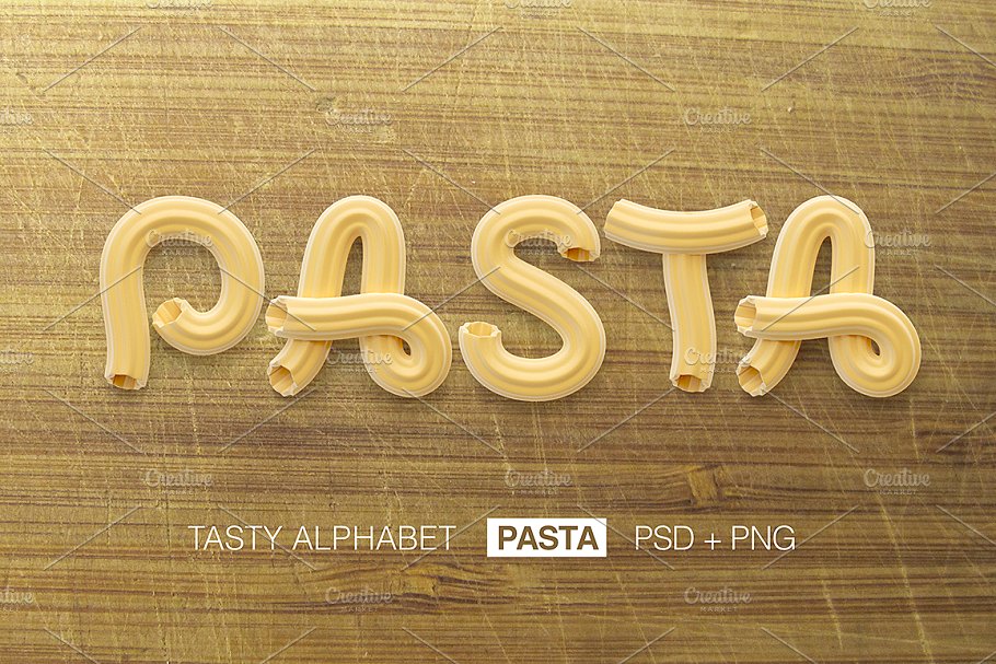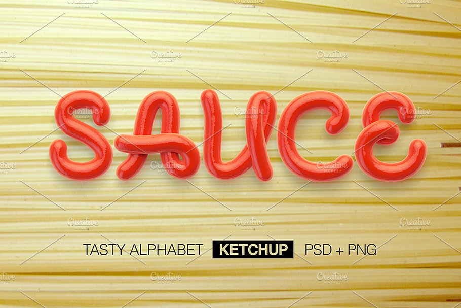这组合集里面有四个装饰性的字母,是用不同的食物做成的(意大利面、番茄酱、芥末、红鱼子酱)。每个字母文件有1000×1000像素的分辨率。