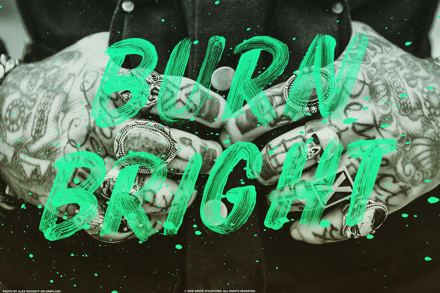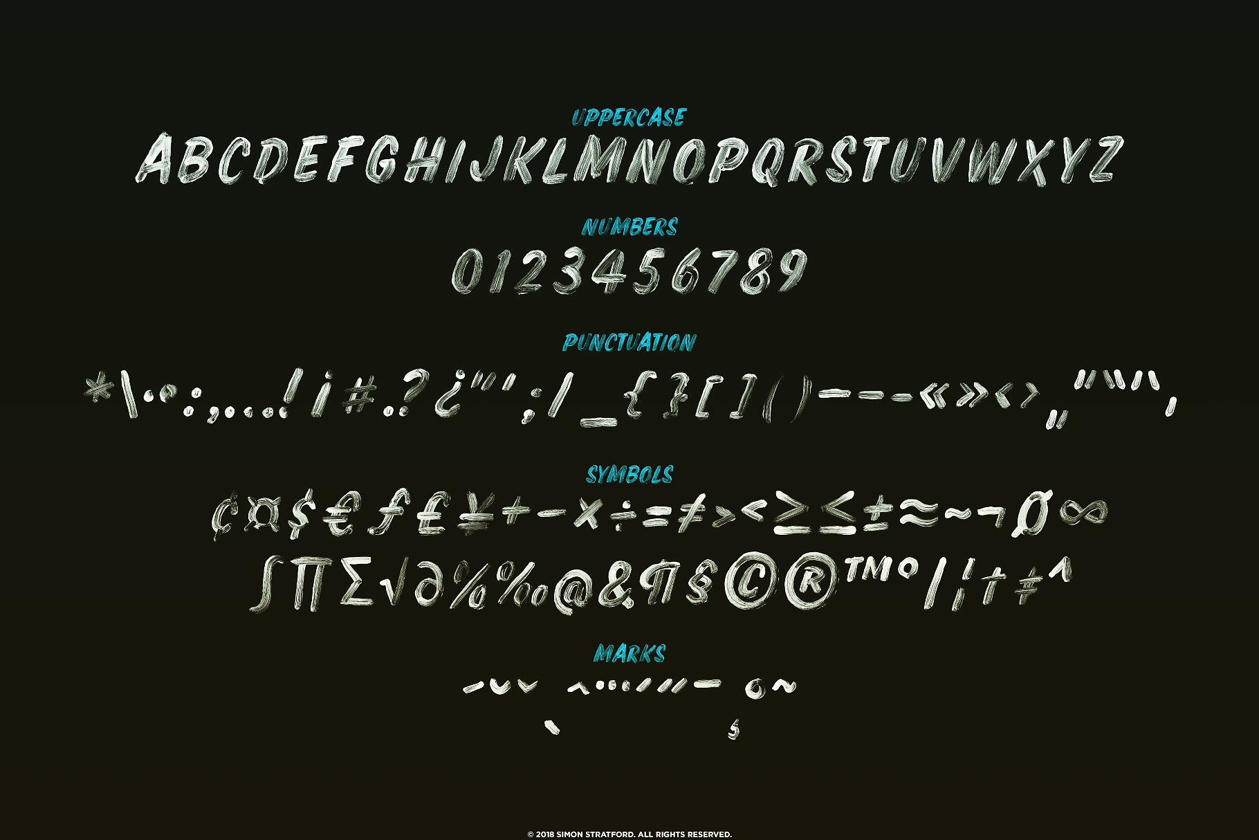 这是一个充满活力的手写油漆英文字体,它有一个街头朋克的外观,将是用于创建包装、海报、广告和任何您能想到的设计项目的理想素材。如果您正在为大格式打印创建设计,我还建议使用高分辨率图像,因为它们比OpenType-SVG字体(大约700px)有更多的细节。我还将字体转换为传统的黑白字体,可以在任何应用程序的Windows和Mac上使用。