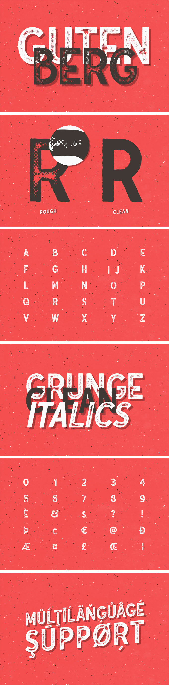 粗略的墨水边缘,296个字形和多语言支持 – 这一切都与古腾堡有关。根据您的目标和理想的效果,您有机会选择粗糙和干净的风格。它有目的地创造出瑕疵,无疑满足任何设计渴望,如徽标,广告,品牌推广,商业广告,打印输出,网页设计项目和演示文稿。一个套件中的巨大历史遗产,用于其现代转型!
