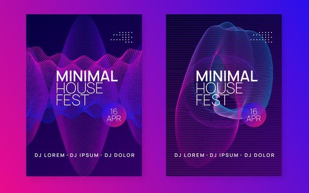 渐变抽象波浪科技感DJ音乐派对海报。 动态流体形状和线条。 极简的音乐会海报封面集。 霓虹音乐传单、 电舞DJ、电子音响节、俱乐部活动海报。