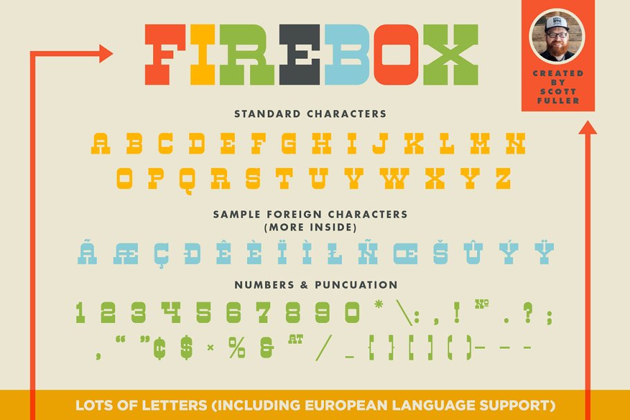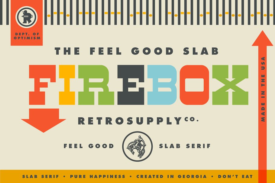 这是一款衬线字体,有一个男孩戴着牛仔帽。还有一些色彩鲜艳的图。