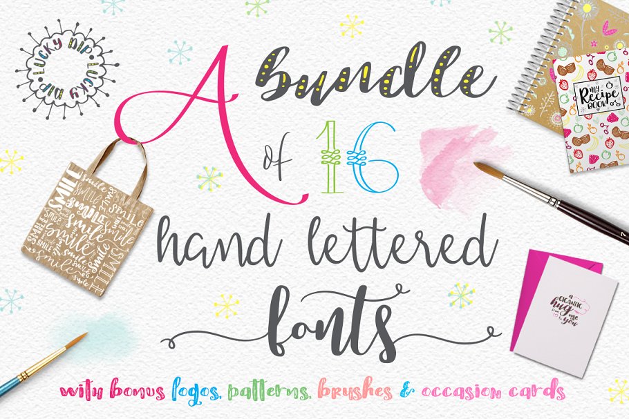 Lucky Dip包括各种字体的选择,从脚本到图案分层字体,你将能够创建无尽的字体设计服装、标志设计、贺卡或只是为了好玩!