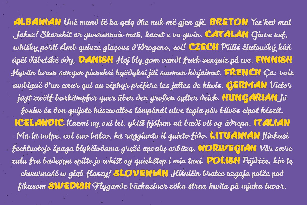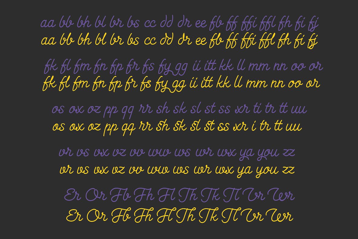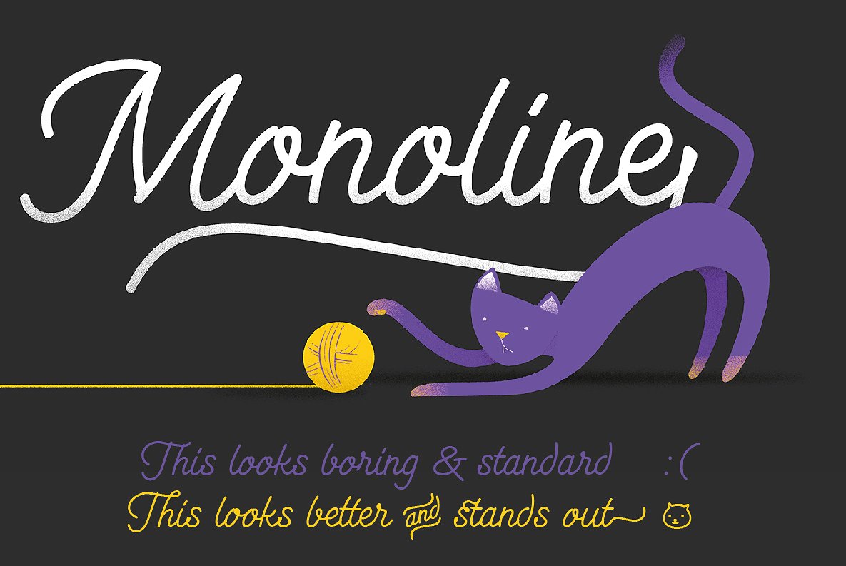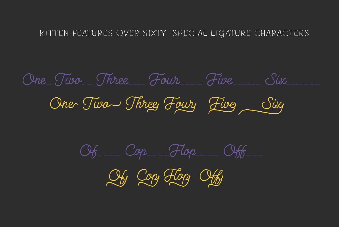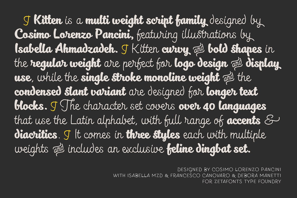小猫是一个多重脚本系列,具有标志画家美学和各种变体,替代品和连字。其常规重量的曲线,大胆形状非常适合标志设计和展示使用,而清洁的轻量级,以及Monoline和浓缩Slant变体,非常适合较长的文本块。小猫涵盖了40多种使用拉丁字母的语言,具有全方位的口音和变音符号。它有五种重量,有三种款式:Regular,Slant和Swash。Kitten充分利用OpenType连字以避免大写字母冲突,并提供替代品和各种结扎字符,以获得更加手工制作的自然外观。可以通过字形调色板或在字母后面键入一到六个下划线来访问花苞。